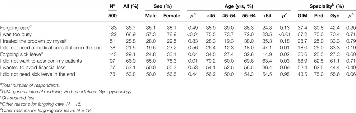 - Forgoing care was investigated using the following question: “In the last 12 months, did you ever plan to visit a general practitioner or specialist for a health problem (or a check-up) and then eventually decide not to do so?” [yes, no]. In cases where care had been forgone in the last year, the following answers were available (multiple choices possible): “I was too busy,” “I treated the problem by myself,” “I did not need a medical consultation in the end,” “Other” (to be specified). Forgoing sick leave was investigated using the following question: “In the last 12 months, did you ever consider taking a few days (or more) off work for health reasons and then eventually give up?” [yes, no]. In cases where sick leave had been forgone in the last year, the following answers were available (multiple choices possible): “I did not want to abandon my patients,” “I wanted to avoid financial loss,” “I did not need sick leave in the end,” “Other” (to be specified).
