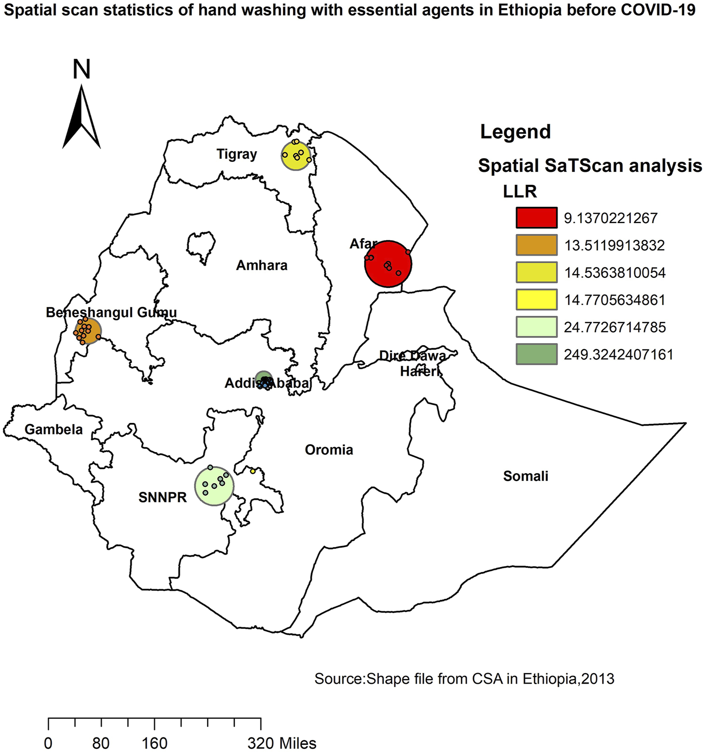 The circles represent the most statistically significant spatial windows of handwashing practice with essential agents. There was high handwashing practice with essential agents within the clusters than outside the cluster (Figure 3).