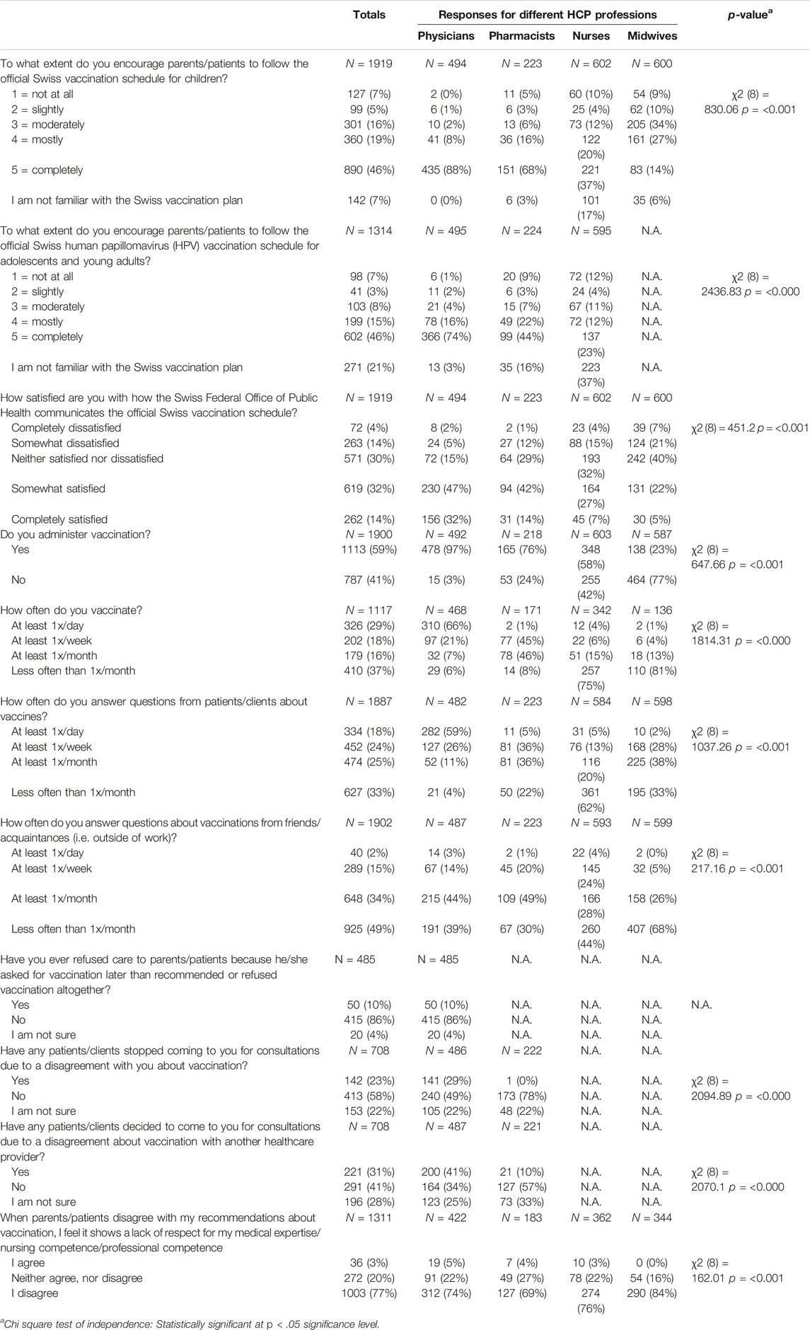 | Totals | Responses for different HCP professions | p-valuea | ||||