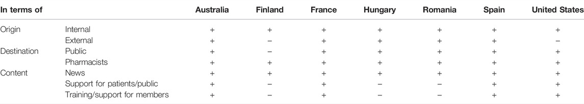 Different types of documents were found on the analysed websites. Internal documents, created by the national pharmacists’ associations, some of them in collaboration with partners and/or competent authorities, and external documents, created by other institutions, were identified. Additionally, documents for both members and patients were published. A certain amount of variation in their content was found, including news about the pandemic evolution, documents providing support for public or patients, and resources for training and support for pharmacists. A comparative synthesis is presented in Table 1.