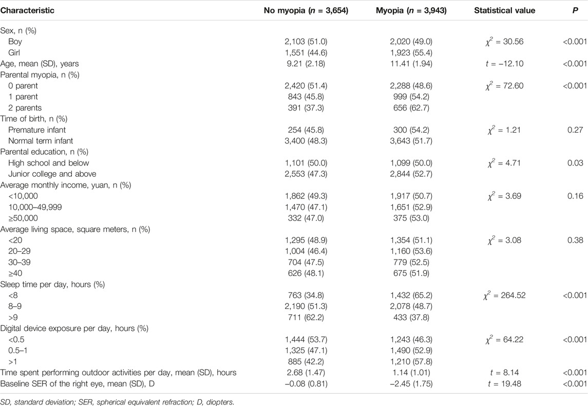 | Characteristic | No myopia (n = 3,654) | Myopia (n = 3,943) | Statistical value | P |