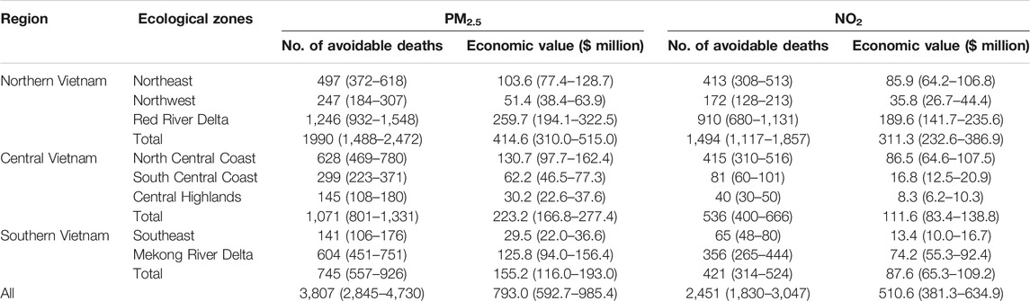 Table 2 displays the total number of avoidable deaths and corresponding economic benefits for each region in Vietnam. Considering that economic benefits represent the intangible costs, including the value of suffering and leisure time lost, and demonstrates the tangible costs of medical treatment. Overall, reducing PM2.5 concentrations could have prevented approximately 3,807 deaths (95% CI: 2,845–4,730) in Vietnam in 2019, resulting in potential savings of up to $793.0 million (95% CI: 592.7–985.4). The Red River Delta region would have benefited the most economically from this reduction, with potential savings of about $414.6 million. Additionally, reducing NO2 concentrations could have prevented a total of 2,451 deaths (95% CI: 1,830–3,047), resulting in potential savings of approximately $510.6 million (95% CI: 381.3–634.9). Once again, the Red River Delta region would have benefited the most economically from this reduction, with potential savings of almost $311.3 million.