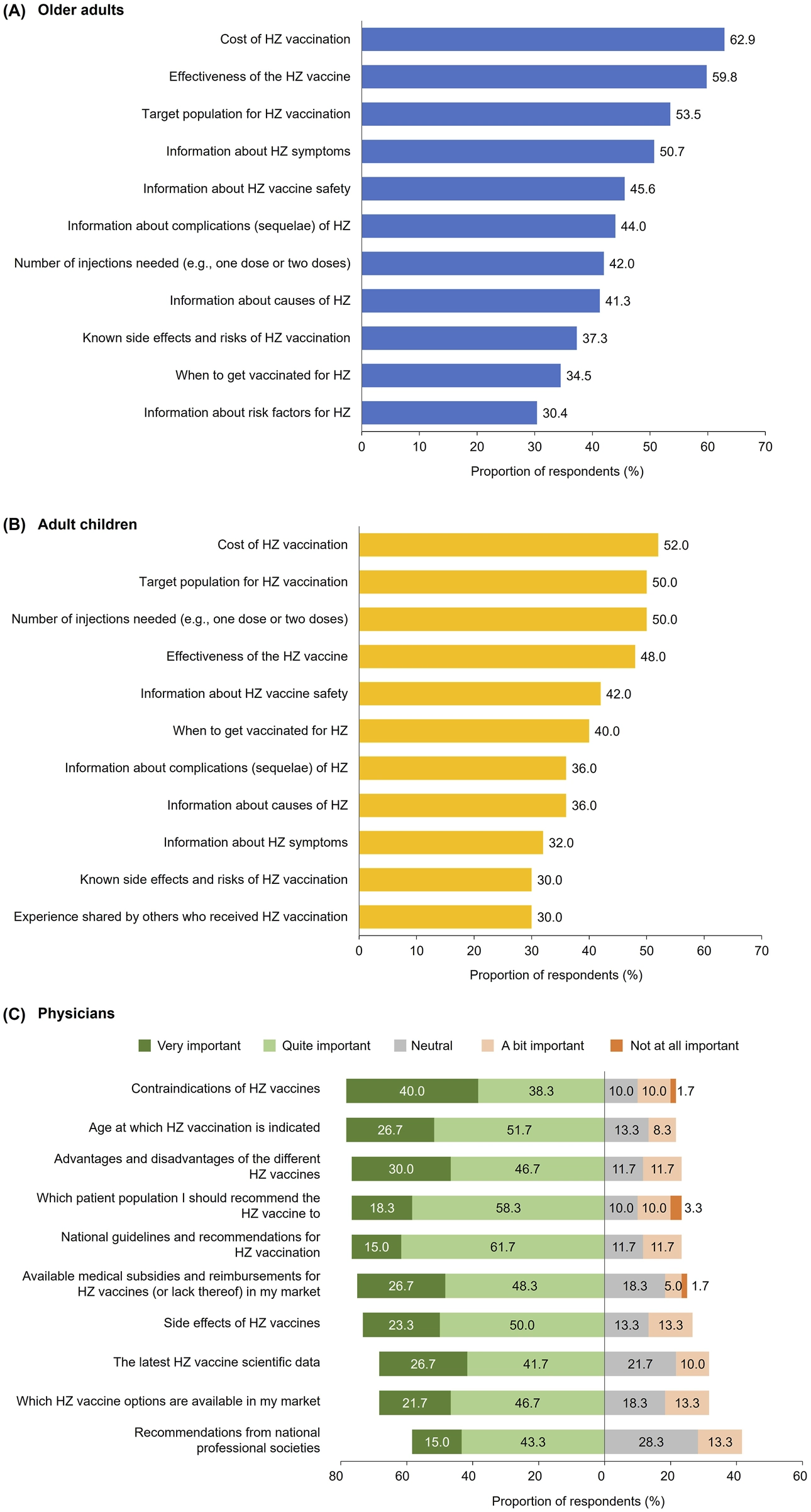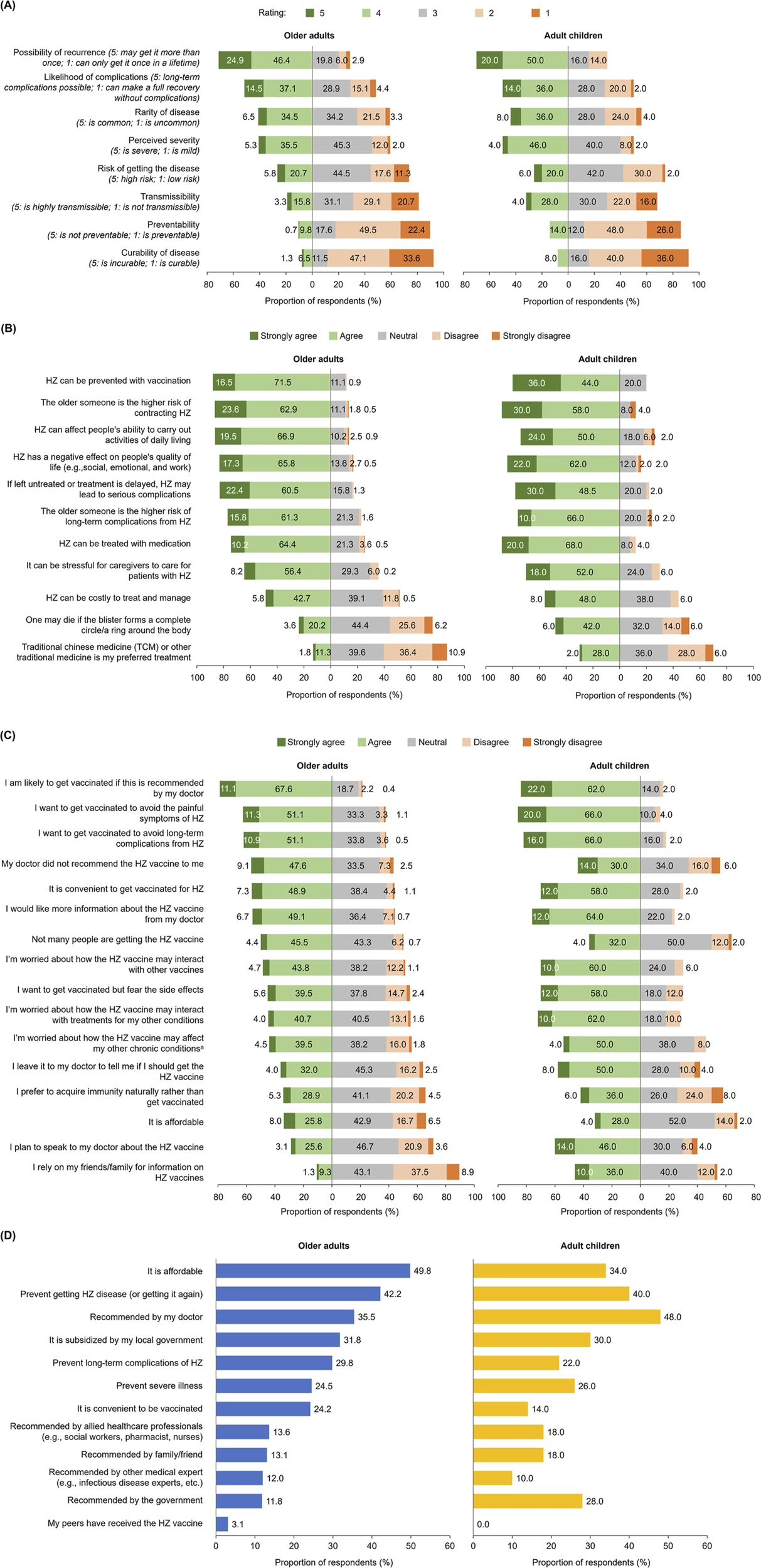 Older adult (aged ≥50 years) and adult children (aged 30–49 years, with parents aged ≥50 years) respondents included in the study were aware of HZ, and open to preventive vaccination. Data were rounded to the first decimal place and the sum of values may not total to 100%.