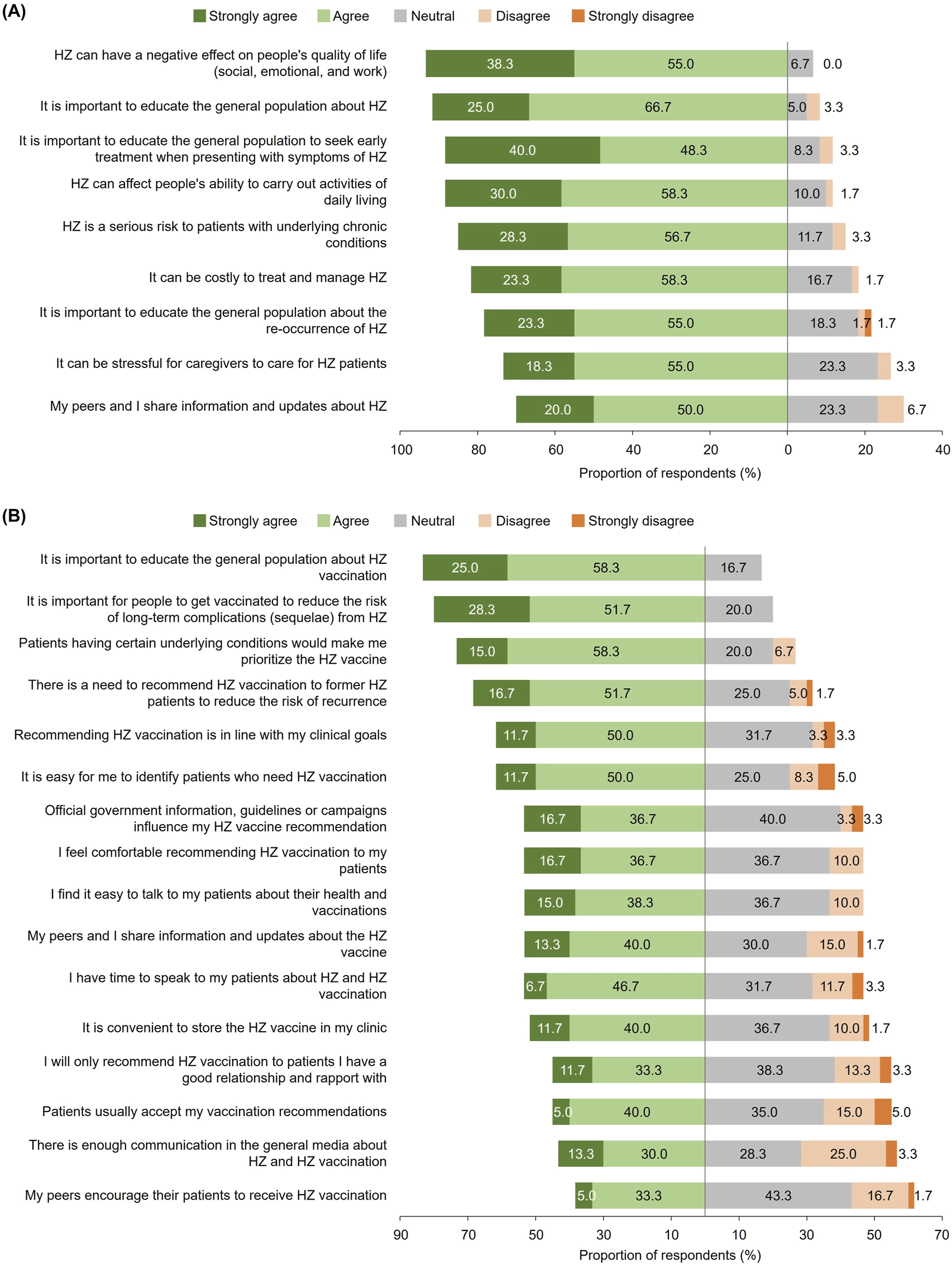 Despite high awareness of HZ (92.9%–94.0%) and HZ vaccination (76.0%–80.4%) among the public, knowledge about HZ, HZ vaccination rates (13.1%–32.0%), and intention to vaccinate (12.6%–18.2% among non-HZ-vaccinated respondents) were low. Public respondents were likely to vaccinate against HZ upon physician recommendation (78.7%–84.0%), but physician recommendation was limited by barriers including perceived low patient willingness (51.7%) and vaccine cost (51.7%). Various forms of government support could encourage patient-physician discussions regarding HZ and aid HZ vaccination uptake among the public (30.0%–53.3%).