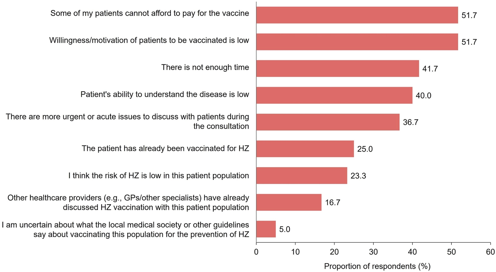 Physicians demonstrated ample knowledge of HZ, its symptoms and long-term complications, the at-risk population, and its risk of recurrence. They could also assess different HZ vaccines by factors including their nature, contraindications, side effects, and costs. Physicians reportedly prioritized vaccination for diseases with greater prevalence and perceived severity (e.g., pneumococcal disease, influenza), as well as on patient’s request. Concerns regarding out-of-pocket vaccine expense for patients and perceived hesitancy/unwillingness among patients to get vaccinated were additional barriers to their active recommendation of HZ vaccination. They acknowledged the need for government support, through official government information and subsidies, for clinical decision-making regarding HZ.