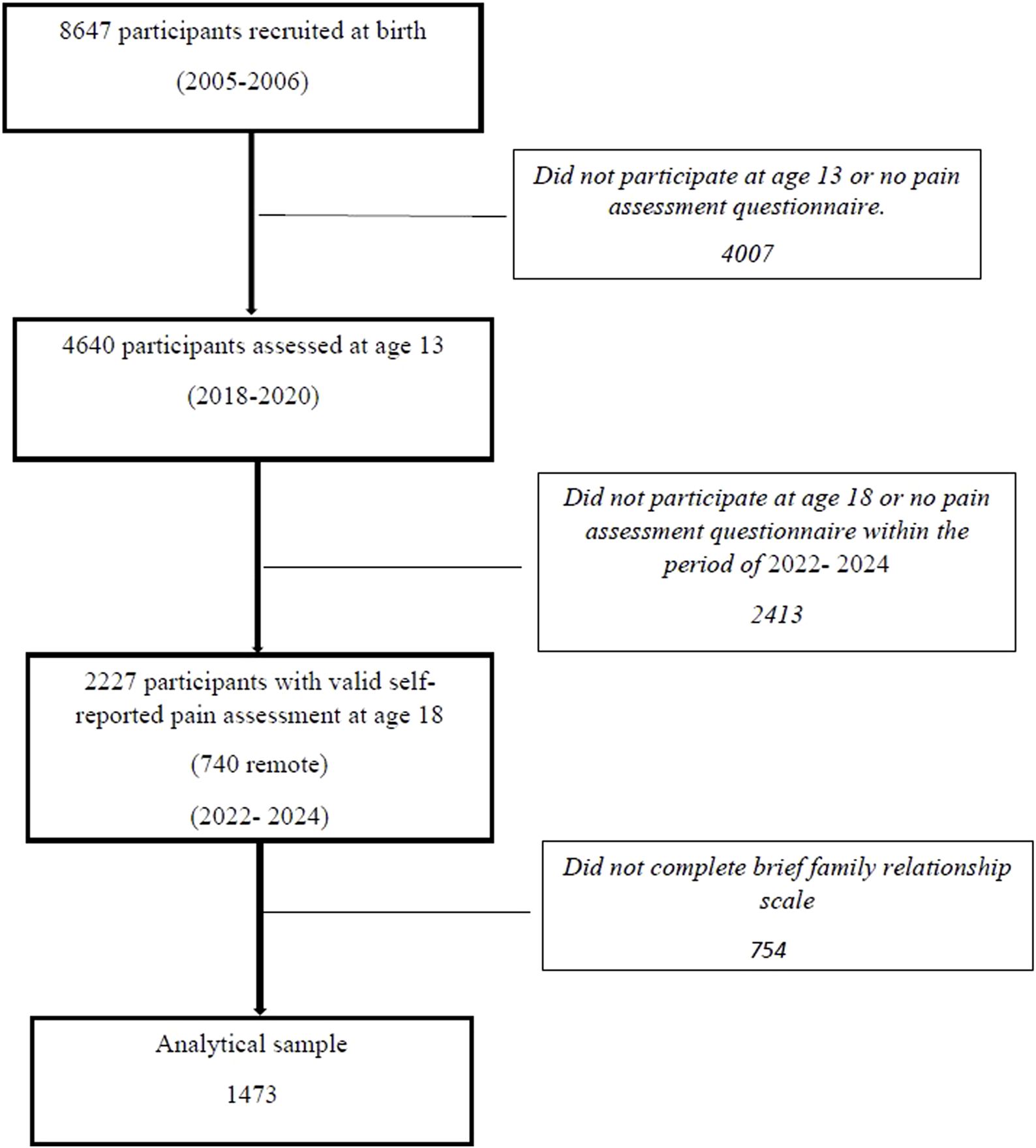 For this study, we used pain data collected at age 18, a follow-up wave that started remotely in June 2022 through a dedicated mobile application called “SEPIA,” developed in collaboration with the Institute of Systems and Computer Engineering, Technology and Science (INESC TEC) of the University of Porto. The development and implementation of SEPIA involved patient partners, who contributed to the study design, conduct, and interpretation of results, ensuring that the research addressed relevant needs and experiences. The application was intended to collect data about prior pain experiences from each adolescent and one caregiver (92% mothers, who were identified as primary caregivers since recruitment). Caregivers in the cohort who had provided their email addresses were emailed by the research team (5,756 families), and those who agreed to participate were sent a set of links and credentials to access the application (link: https://ispup.up.pt/sepia/). A total of 740 participants provided data remotely through the SEPIA mobile application. Besides pain data, other information, such as data on family functioning, was collected via the application. This collection was complemented with data from the ongoing G21 wave of in-person evaluations, including participants who finished the pain-related assessment by September 2024, using the same application and tools. In this study, we included participants who responded to the Lübeck Pain Screening Questionnaire and the Brief Family Relationship Scale at age 18, from June 2022 to September 2024, using remote and face-to-face modalities, resulting in a final sample of 1,473 (Figure 1).