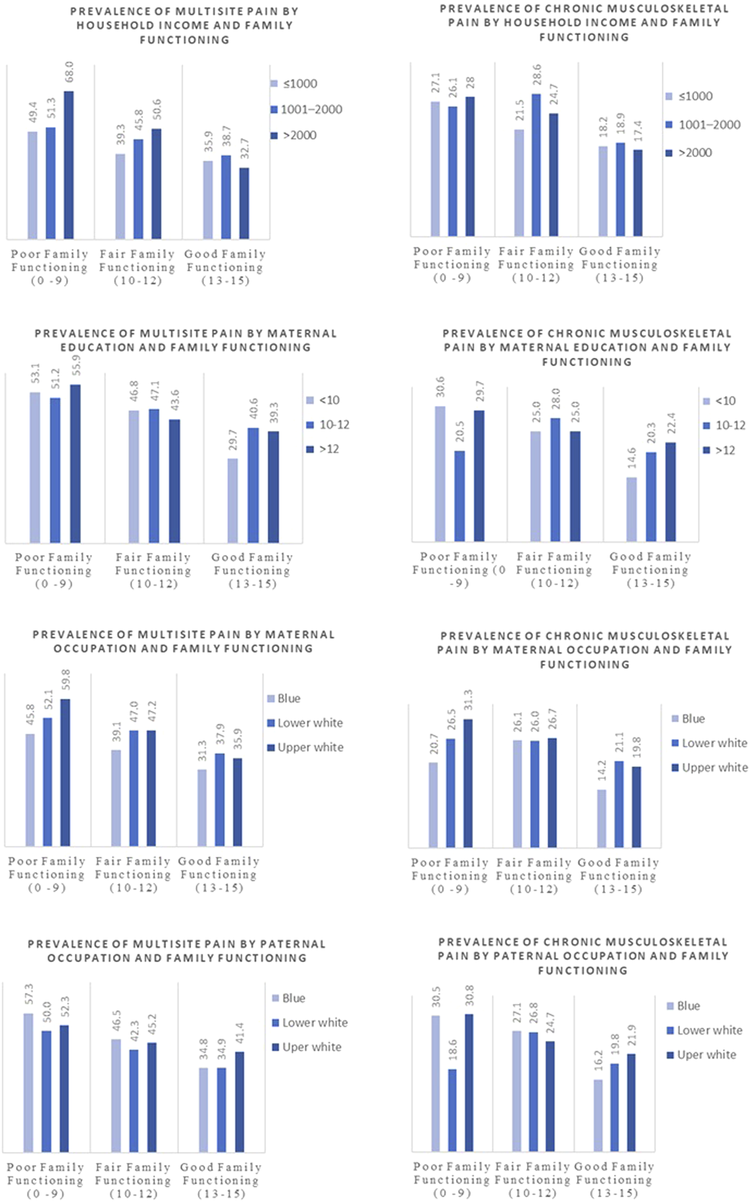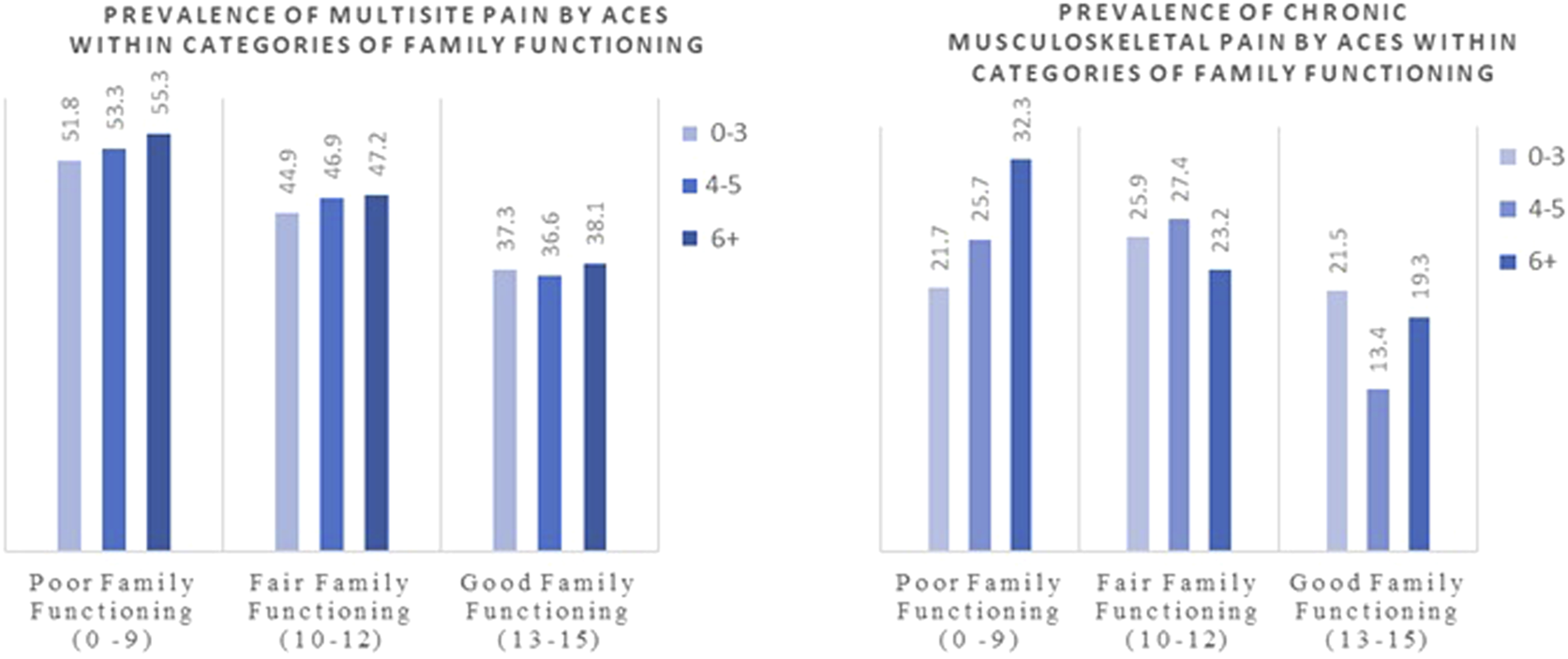 To enhance the visualization of our results, based on data distribution, we categorized the overall family functioning score (mean = 11.6, median = 12) into three groups: poor (0–9), fair (10–12), and good (13–15). Stratified analyses using chi-square (χ2) tests were conducted to explore subgroup differences in the prevalence of pain outcomes (multisite and chronic musculoskeletal pain) by family functioning (relationship categories 0–9, 10–12, 13–15) across SES levels and by number of ACEs.