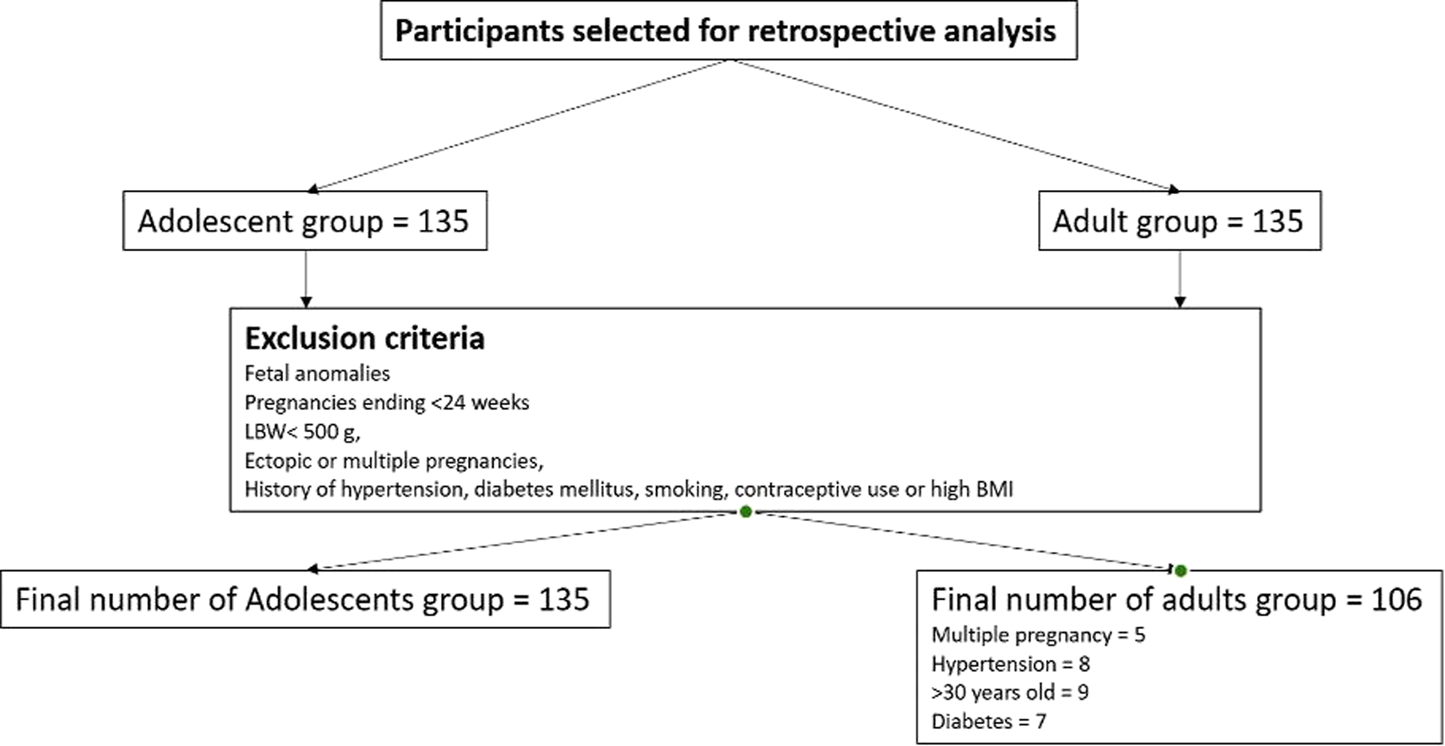 The study population included all available medical records of primiparous women aged 10–19 years who delivered at the Multidisciplinary city hospital in Astana, a tertiary-level referral and teaching facility with 529 beds serving as a regional referral center and one of the largest perinatal care institutions in Central Asia, providing wide range of obstetric and neonatal services. The hospital is a JCI-accredited, and maintains a fully integrated electronic Medical Information System (MIS) that ensures standardized, routinely updated clinical data entry by obstetric and neonatal staff. Attempts to include more data from other medical institutions in Kazakhstan were unsuccessful due to denial of access to medical information and legal restrictions, limiting the sample expansion of both adolescent and adult groups. All data included in the analysis were complete. Participants categorized as adolescents (10–19 years) and adults (20–30 years) based on the WHO definition of adolescence [30]. A total of 270 participants were initially selected for this study and divided into two groups: adolescent group (n = 135) and adult group (n = 135). Note the adult age-range represents the demographic distribution with the lowest physiological risk for obstetric complications according to prior research [31, 32]. Although women aged 20–24 years may share some social and biological characteristics with older adolescents, this grouping allowed consistency with international literature and ensured adequate sample size for comparison [32]. Nevertheless, the adolescent group was divided into two subgroups: younger adolescents (10–16 years) and older adolescents (17–19 years); the adult group was divided into younger adults (20–24 years) and older adults (25–30 years). Exclusion criteria: The study focused on low risk singleton pregnancies, and to reduce clinical heterogeneity, women who were carriers of fetal anomalies, pregnancies ending before 24 weeks of gestation and/or with a birth weight <500 g, ectopic or multiple pregnancies, age over 30 years were excluded. Similarly, those who had pregestational hypertension, diabetes mellitus, smoking, history of hormonal-based contraceptive use or high BMI before pregnancy were also excluded from this study. Therefore, of the original 135 adult participants, 29 were excluded according to the predefined criteria, resulting in a final sample of 106 adult mothers. The adolescent group of 135 young mothers remained unchanged after applying the exclusion criteria. Therefore, the final study population comprised 241 participants: 135 adolescent mothers (10–19 years) and 106 adult mothers (20–30 years). The overall study selection is shown in the flow diagram (Figure 1).