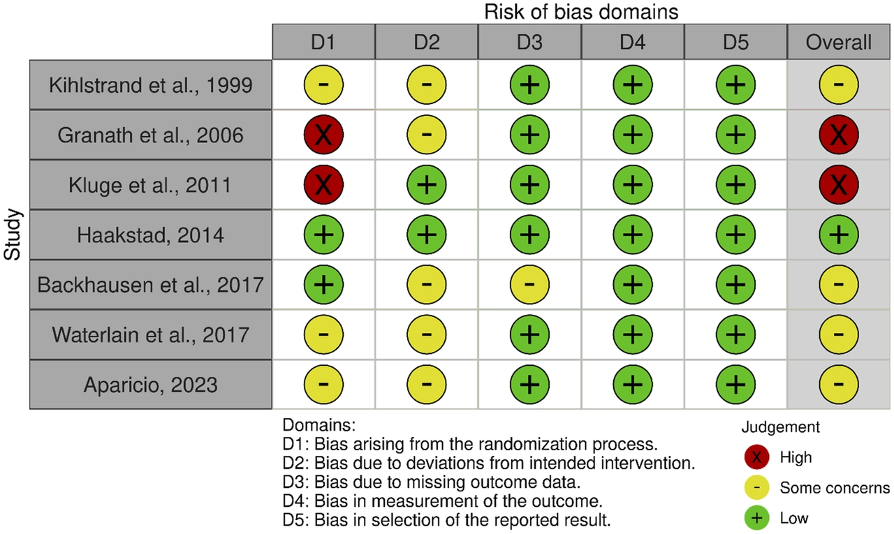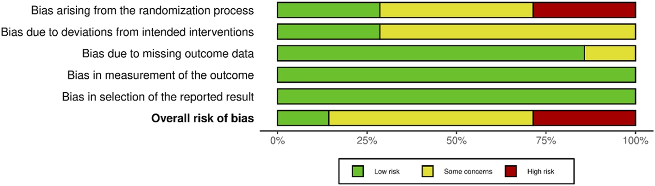 For RCT, risk of bias in the included randomized controlled trials (RCTs) was assessed using the Cochrane Risk of Bias 2.0 (RoB 2) tool, following the guidelines of the Cochrane Handbook for Systematic Reviews of Interventions [22]. The assessment included five key domains: (1) bias arising from the randomization process, (2) bias due to deviations from intended interventions, (3) bias due to missing outcome data, (4) bias in measurement of the outcome, (5) bias in selection of the reported result. Each domain was assessed as “Low risk,” “Some concerns,” or “High risk.” To visualize the risk of bias assessment results, the Robvis package in R was used to generate traffic light plots and summary plots, providing an overview of the distribution of bias risks across the included studies [23].