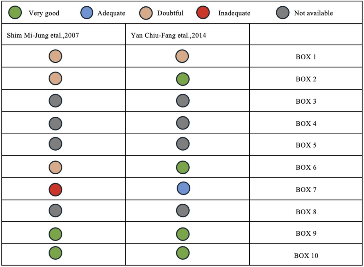 This study used the COSMIN method to assess bias in two NRCTs, revealing key limitations. BOX3, 4, 5, and 8 were “not applicable,” while one paper in BOX7 was rated “inadequate.” Non-randomized trials face inherent challenges: limited resources, small samples, and specific aims, that hinder randomization and blinding, increasing bias risk. Additionally, weak structural validity, unreliable measurements, and lack of cross-cultural validation further undermine credibility and generalizability. Future research should enhance sample diversity and external validity through multicenter designs [53]; employ propensity score matching (PSM) to rectify baseline discrepancies [54]; enhance the standardization of intervention measures [55]; rigorously regulate external variables to improve result reliability [56]; utilize validated instruments and bolster the reliability of data collection [57]. In the data analysis phase, it is crucial to address confounding issues [58], and to prioritize transparent and thorough reporting [55]. Moreover, extended follow-up enhances the longitudinal validity of research [59]. The reliability and validity of NRCTs can be substantially improved by these enhancements.