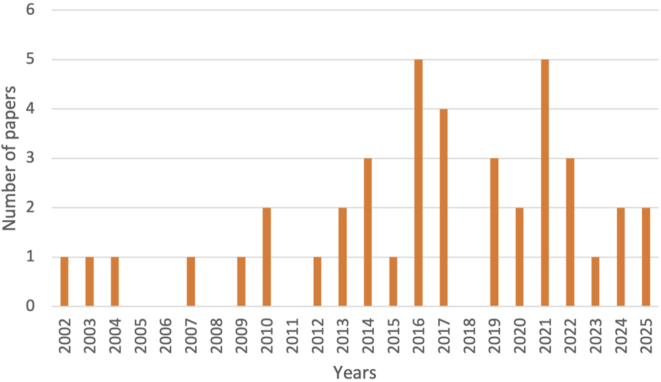 Annual distribution of published papers included in the review (Low- and Middle-Income Countries, 2002–2025).