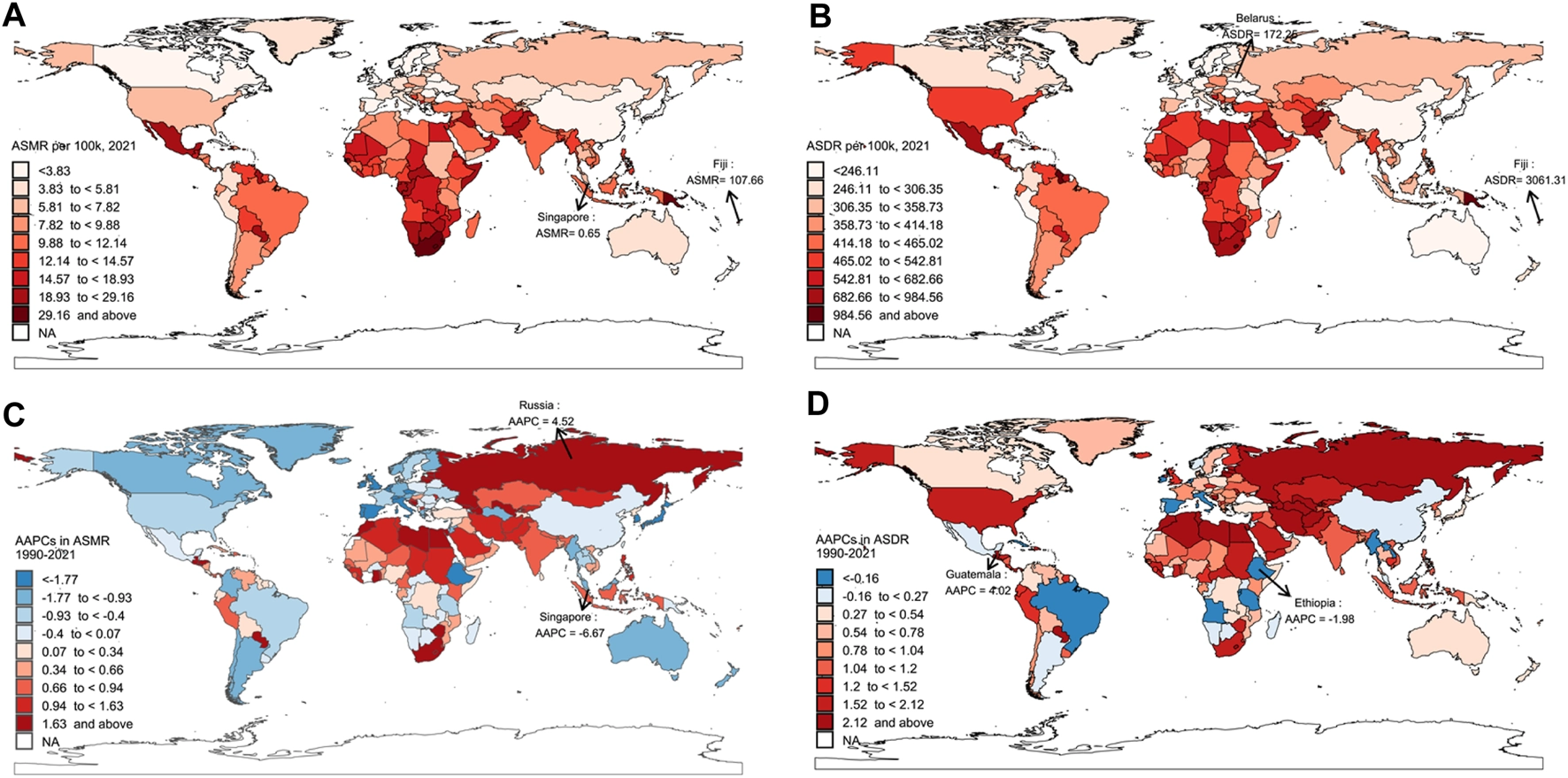 At the national level, Fiji had the highest ASMR (107.66 per 100,000 people) and ASDR (3,061.31 per 100,000 people) in 2021 (Figures 1A,B). Russia had the fastest ASMR increase (AAPC = 4.52), while Guatemala showed the largest increase in ASDR (AAPC = 4.02) (Figures 1C,D). India had the highest number of deaths, reaching 109,041.84, while China recorded the highest DALYs, amounting to 4,875,274.21 (Supplementary Figure S1).