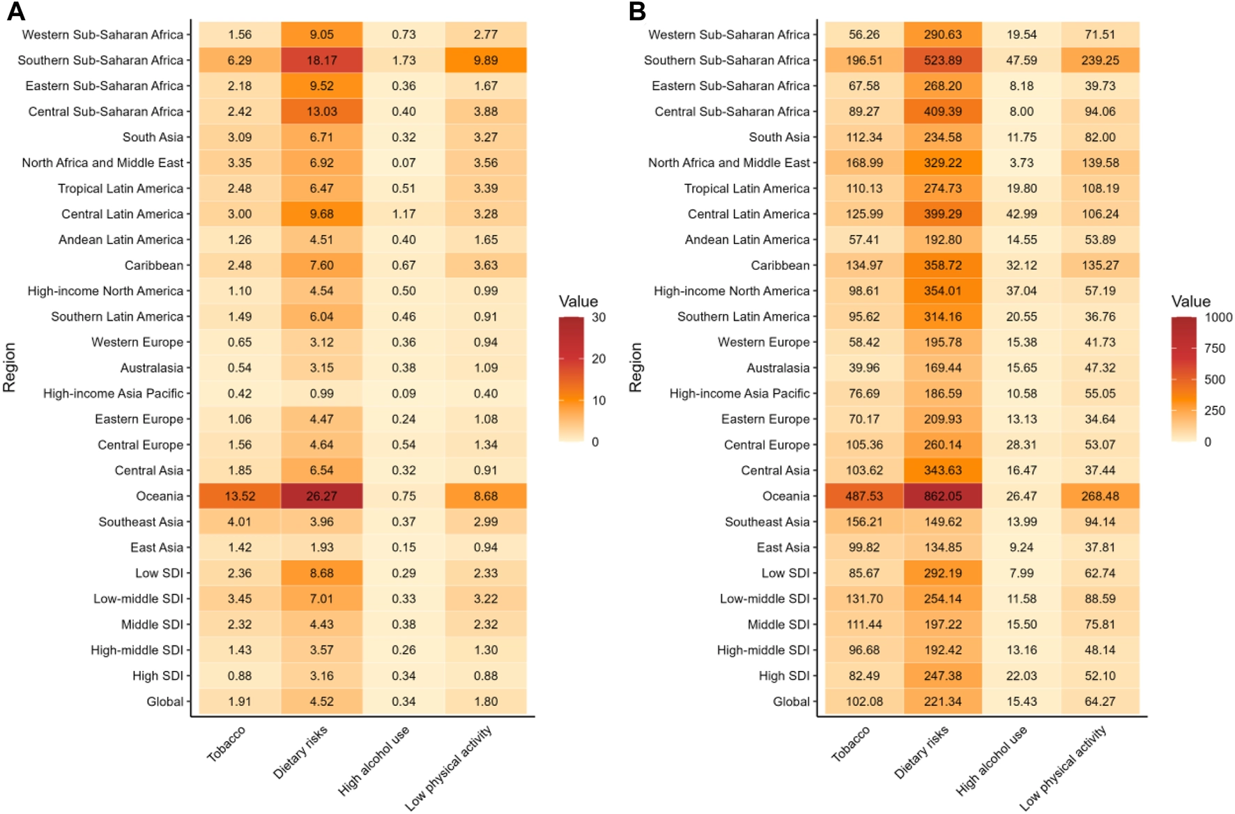 Tobacco emerged as the second leading behavioral risk factor for T2D, with a global ASMR of 1.91 and ASDR of 102.08 per 100,000 people (Table 2). The highest ASMR (13.52 per 100,000 people, 95% UI: 7.63–19.49) and ASDR (487.53 per 100,000 people, 95% UI: 290.44–695.67) for T2D was observed in Oceania (Figure 2; Supplementary Table S2). The risks of tobacco are made up of two main components, smoking and secondhand smoke. These factors showed similar geographic patterns, with the highest ASMR and ASDR in Oceania, Southern Sub-Saharan Africa, Caribbean and South Asia (Supplementary Figure S2).