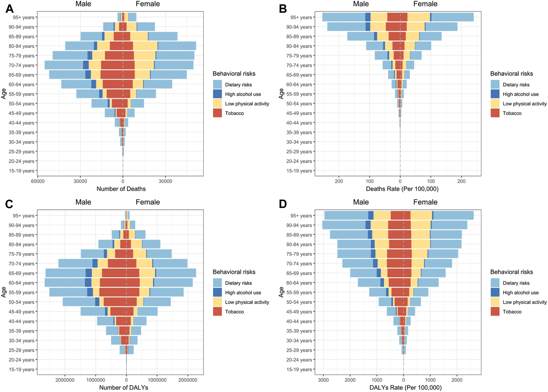 In 2021, T2D deaths attributable to behavioral risks varied by age, peaking in males aged 70–74 and females aged 80–84 (Figure 3A; Supplementary Table S3). The age-specific mortality rate increased exponentially with age, with higher rates observed in males than in females from age 30 onward (Figure 3B; Supplementary Table S4). The age groups most affected by DALYs due to T2D were males at ages 60–64 and females at ages 65–69, with total DALYs of 16.12 million for males and 14.07 million for females (Figure 3C; Supplementary Table S3). Consistent with the age-specific mortality rate, males showed higher age-specific DALYs rate than females, with rates increased substantially with age, except for males in the 90–94 age group (Figure 3D).