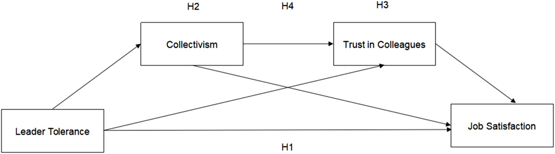 H4Collectivism and trust in colleagues sequentially mediate the relationship between leader tolerance and job satisfaction.
