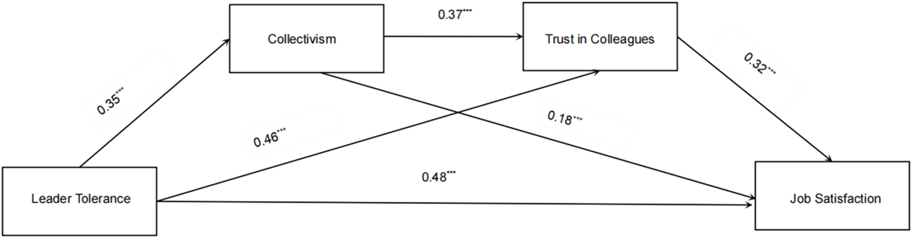 Leader tolerance significantly increases job satisfaction (β = 0.48, p < 0.001), with collectivism (β = 0.18, p < 0.001) and trust in colleagues (β = 0.32, p < 0.001) serving as powerful mediators. Together, these mediators account for 51.16% of the total effect, with trust in colleagues emerging as the dominant pathway mediator (30.23%).