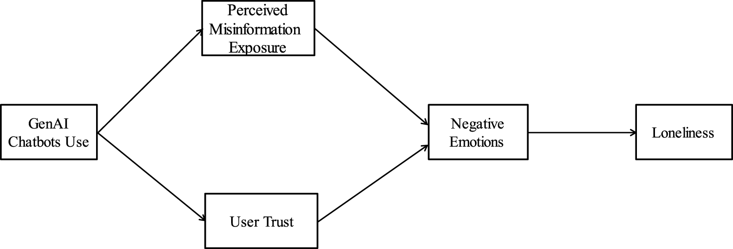Further, TAM and UTAUT emphasize that technology adoption is shaped not only by perceived usefulness and ease of use but also by perceived trust, perceived risk, and social influence [26, 27]. In the context of GenAI, user trust and information discernment are intertwined with cognitive processing and emotional responses, forming a complex psychological pattern [42]. Integrating the above perspectives, we propose a dual-chain mediation framework comprising (a) an “information-quality path” (GenAI chatbots use→perceived misinformation exposure→negative emotions→ loneliness) and (b) an “emotional-trust path” (GenAI chatbots use→user trust→negative emotions →loneliness). Based on this framework, we state the following hypotheses in terms of associations and indirect effects: