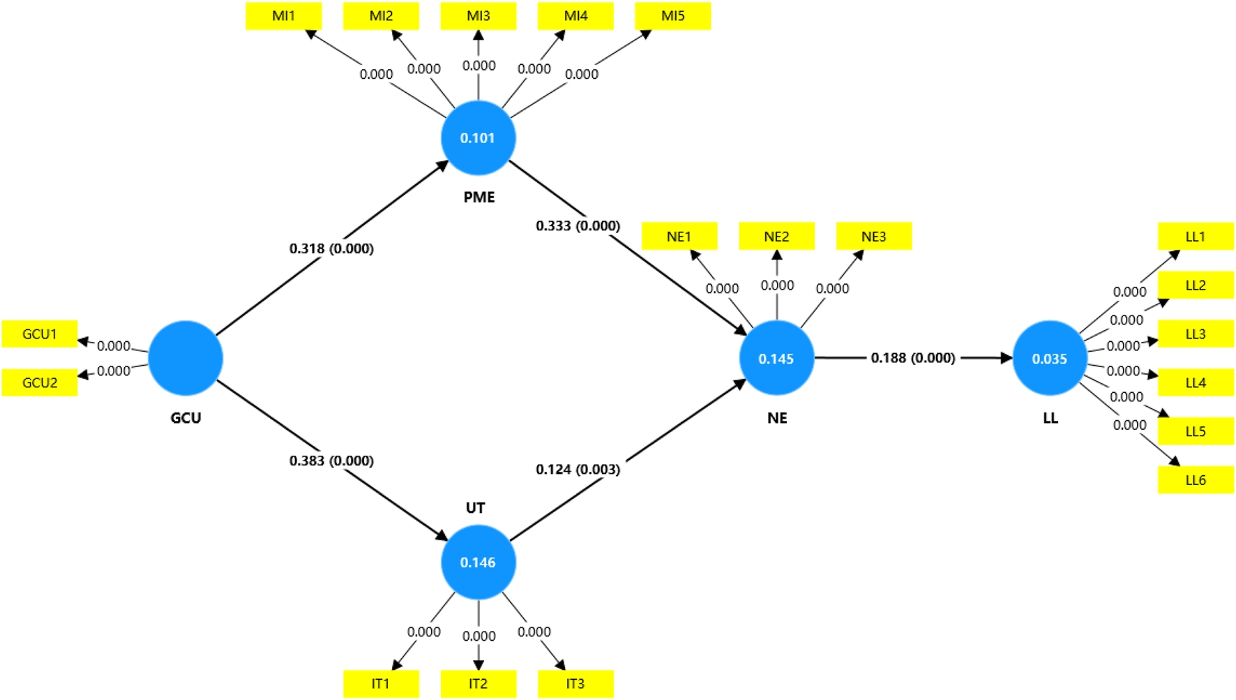 Partial Least Squares Structural Equation Modeling (PLS-SEM) was employed for model and hypothesis testing with SmartPLS 4 [49]. PLS-SEM was selected primarily because it does not require data to strictly adhere to a normal distribution and is more suitable for predictive analysis and handling complex models [50, 51]. The data in this study did not strictly follow a normal distribution and were part of an exploratory study. The empirical analysis followed a two-stage testing process for the measurement model and structural model: first, Cronbach’s Alpha, CR, AVE, and HTMT and Fornell-Larcker indicators were used to test the reliability, convergent validity, and discriminant validity of the scales; subsequently, Bootstrap resampling (5,000 times) was used to test the path coefficients and their significance in the structural model. In addition, we estimated a competing model that added the direct path GCU→LL and compared the explained variance in loneliness between models (ΔR2), using the same bootstrapping settings.