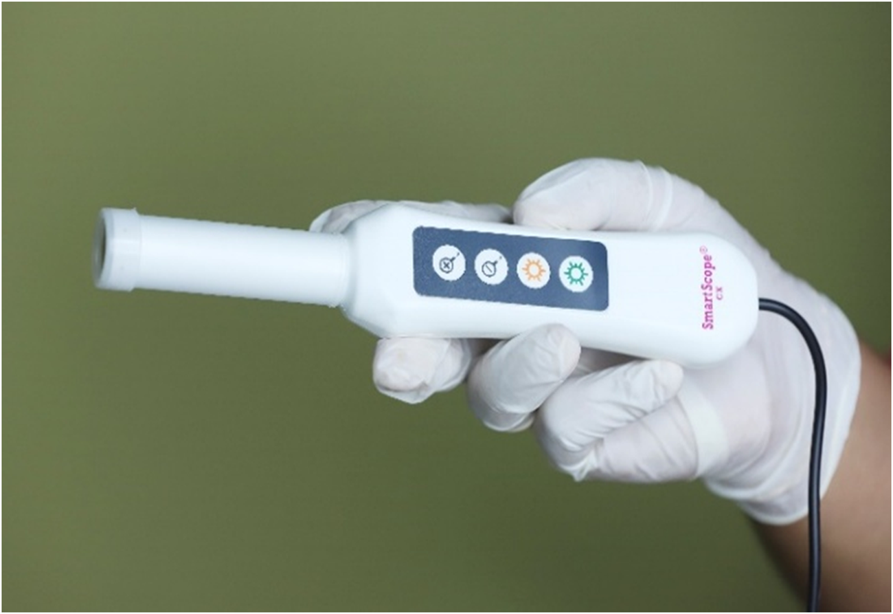 The Smart Scope® CX (SSCX) is a portable, camera-based digital cervicoscope with ×10 magnification, specifically designed for use in low-resource or remote settings (Figure 1). Following insertion of a Cusco’s speculum, the device is introduced into the vaginal cavity to capture high-resolution images of the ectocervix. The SSCX is paired with a dedicated tablet secured with a login password and provides 6–8 h of operation on a full charge.