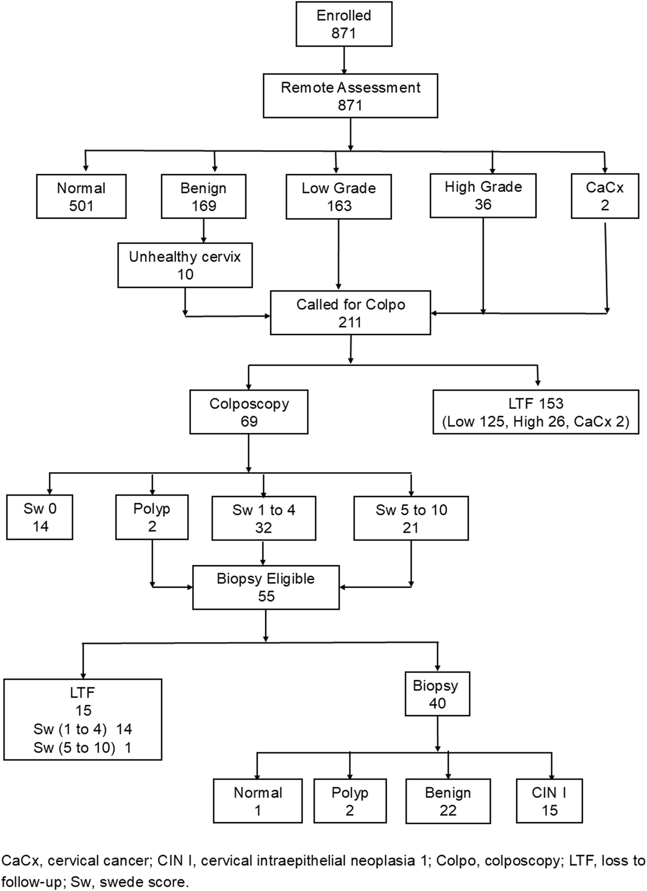 Triaging decisions were based on the remote expert’s assessment. Women classified as screen-positive by remote experts were referred to tertiary centres for colposcopy. Biopsies were subsequently obtained from colposcopy-positive women and sent for histopathological evaluation according to standard clinical protocols.