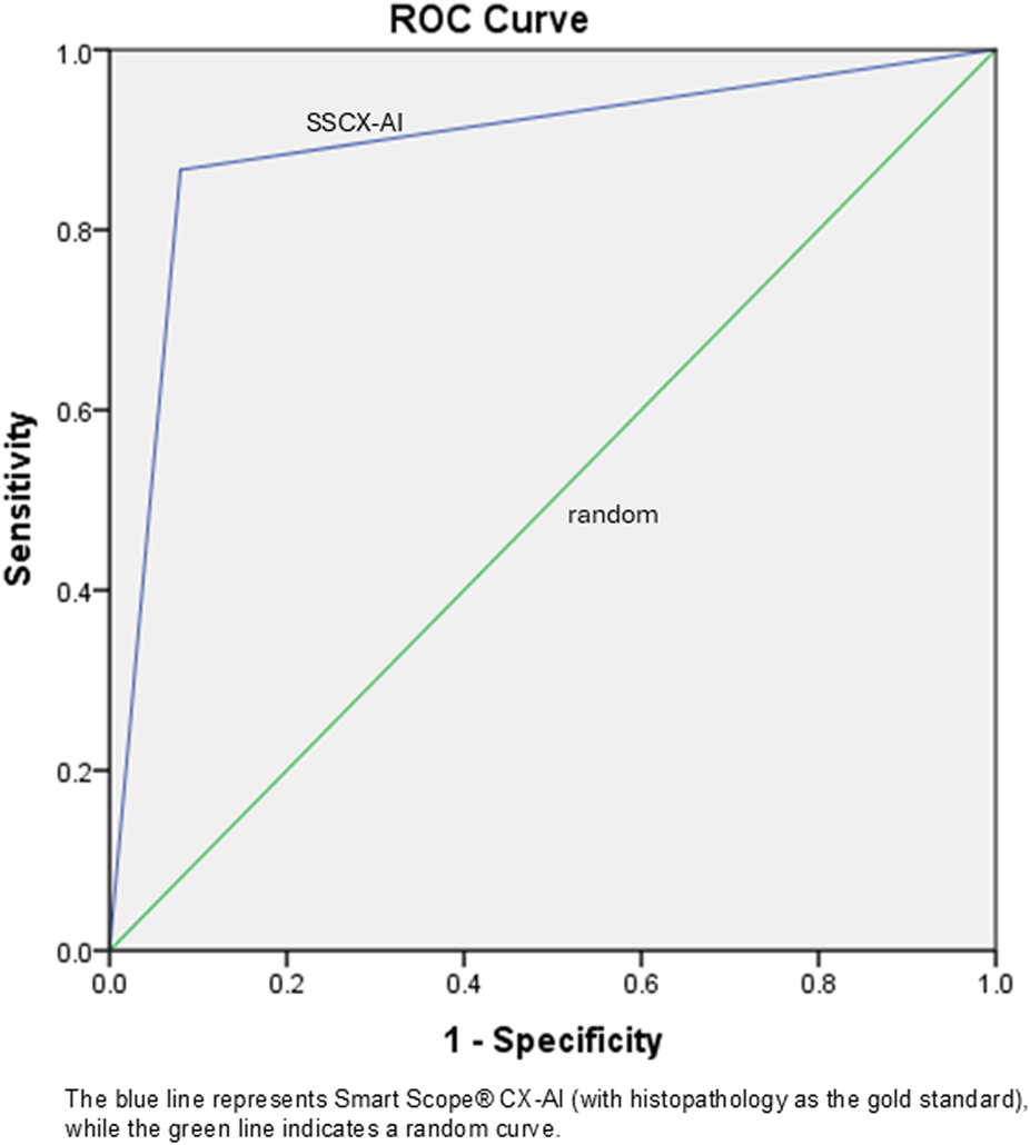 In a pilot study, Talathi et al. compared the Smart Scope® AI (SS-AI) with colposcopy for its application as a screening and triage tool [11] and found the SS-AI system to be comparably effective to colposcopy. In contrast, the concordance between AI and colposcopy or remote expert assessment was weak in the present study. This discrepancy may be attributed to the larger number of experts from multiple PHCs and higher enrolment in our study, compared with the single-centre, smaller sample in Talathi et al.’s study. AI has also been investigated as a triaging tool to guide biopsy decision-making, demonstrating potential to improve diagnostic accuracy and efficiency [12]. In the present study, the AI model both overestimated and missed two cases each, corresponding to an error rate of 4.9% in both directions, which is an acceptable margin for preliminary screening. The AI demonstrated an adequate positive likelihood ratio, AUC, and Pearson correlation coefficient, indicating good agreement between AI assessments and histopathology results. These findings support the feasibility of further evaluating AI in a large-scale screening study as a single-visit “screen-and-triage” tool. Implementing such a model could enable immediate treatment or timely referral to higher centres, reducing loss to follow-up and improving overall program effectiveness.