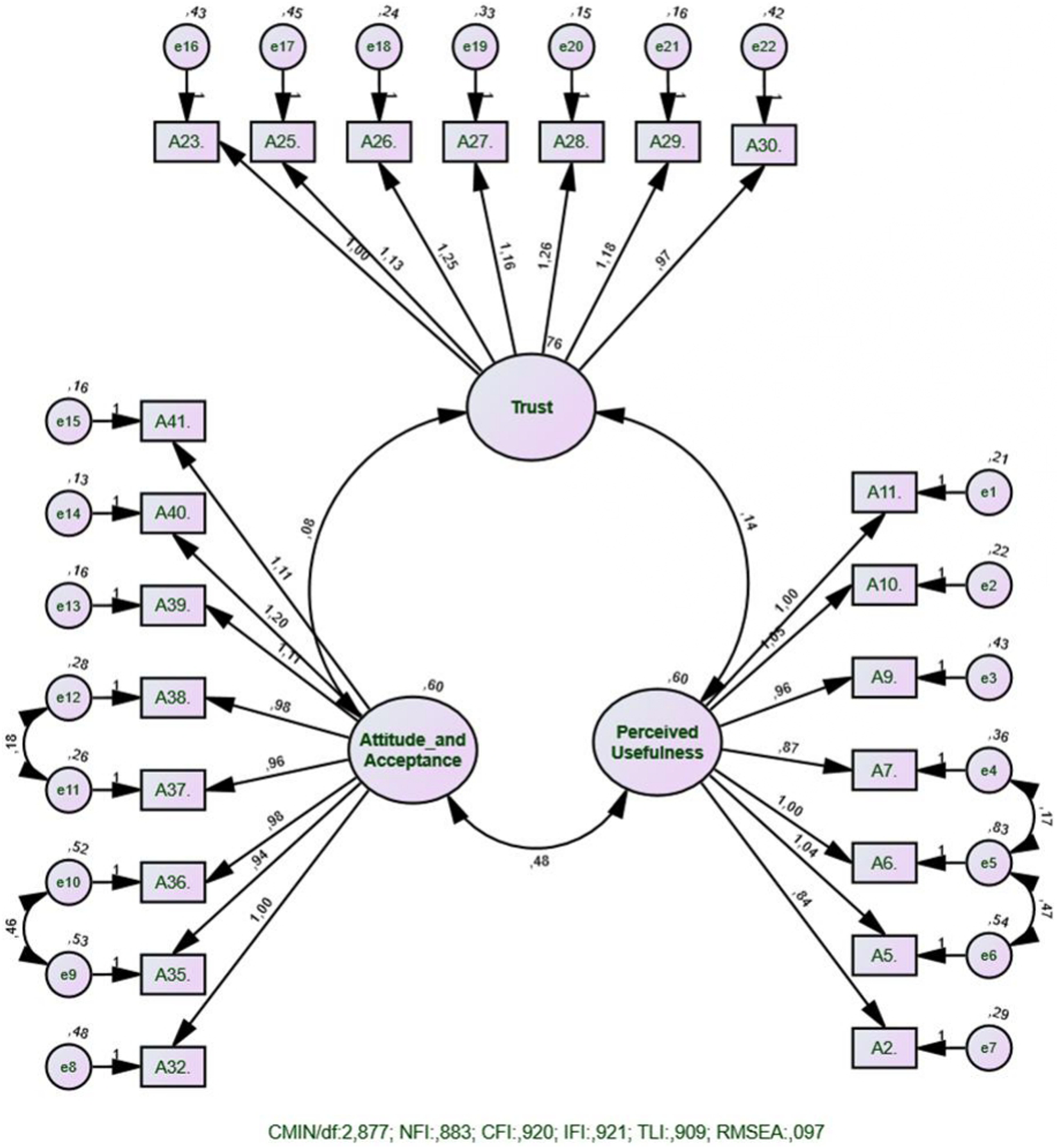 Overall, the CFI, TLI, and IFI values were above 0.90, indicating an acceptable fit of the model [23, 24]. The χ2/df ratio and RMR value also supported this conclusion. Although the NFI value was slightly below the ideal level, this index is known to be sensitive to sample size and model complexity, so it was not considered a sufficient reason to reject the model [25, 26]. The RMSEA value was within the range considered acceptable in the literature [27].