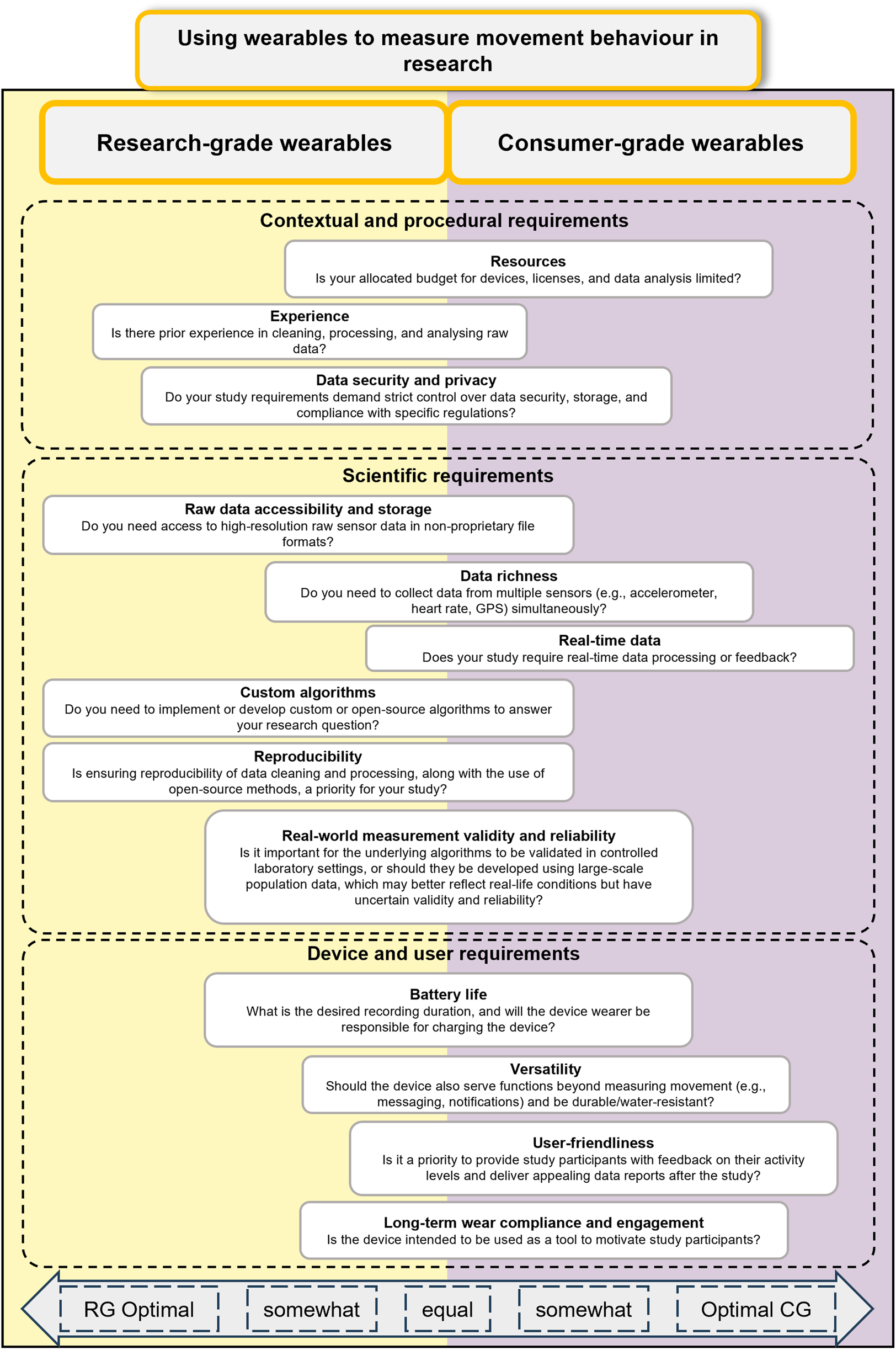 Overview of key considerations for deciding between consumer and research-grade wearables in physical activity research. The horizontal alignment of the text boxes indicates whether the respective topic is better addressed by research-grade (RG) or consumer-grade (CG) wearables if a question is answered with “Yes.” The vertical arrangement of the text boxes does not imply any prioritisation of the topics (Switzerland, 2025).