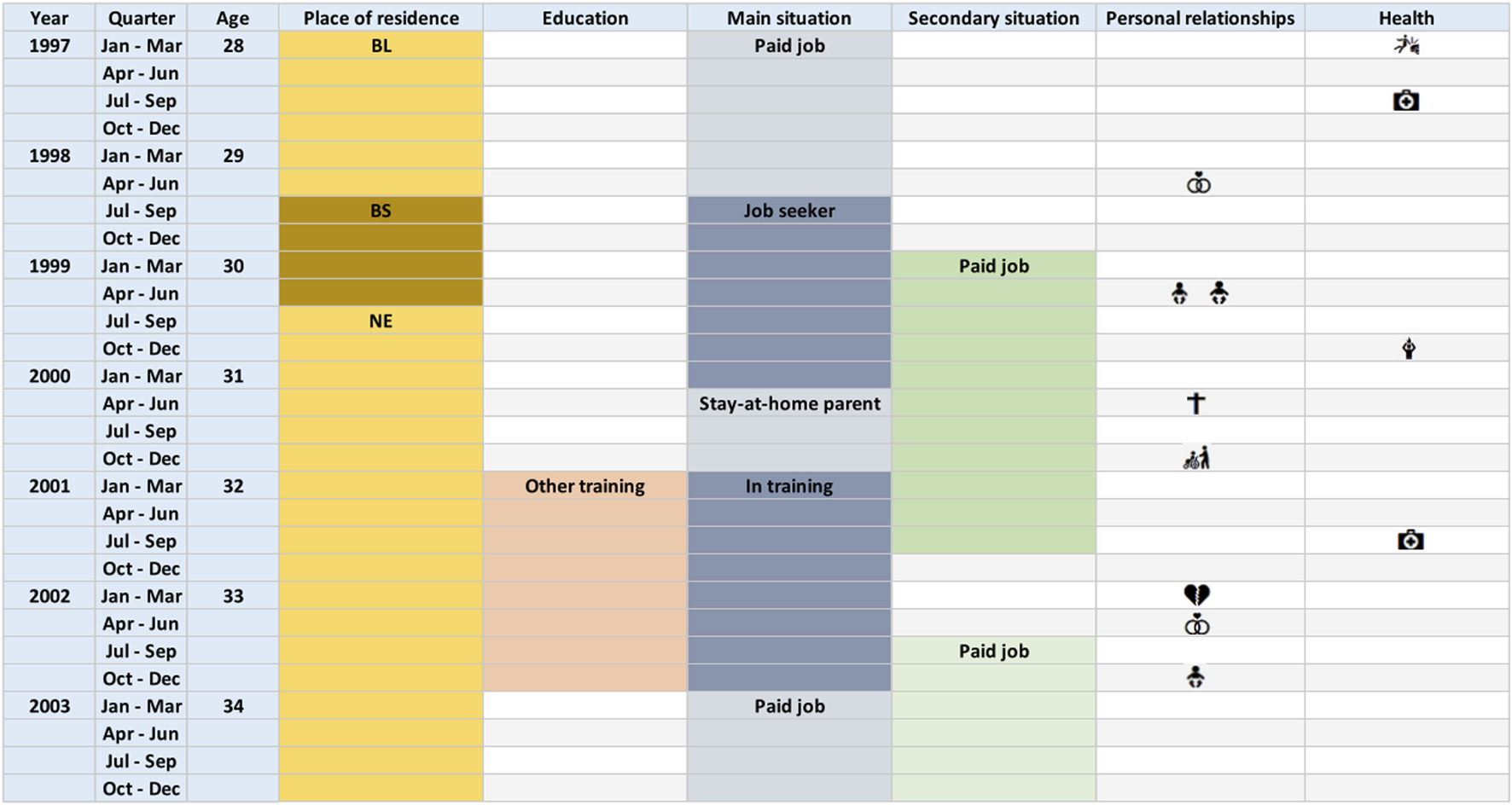 Example for the main screen of a Life History Calendar. Each row represents a trimester and each column, a different life domain. Periods are represented by colored blocks and specific events by icons (Switzerland, 2025).