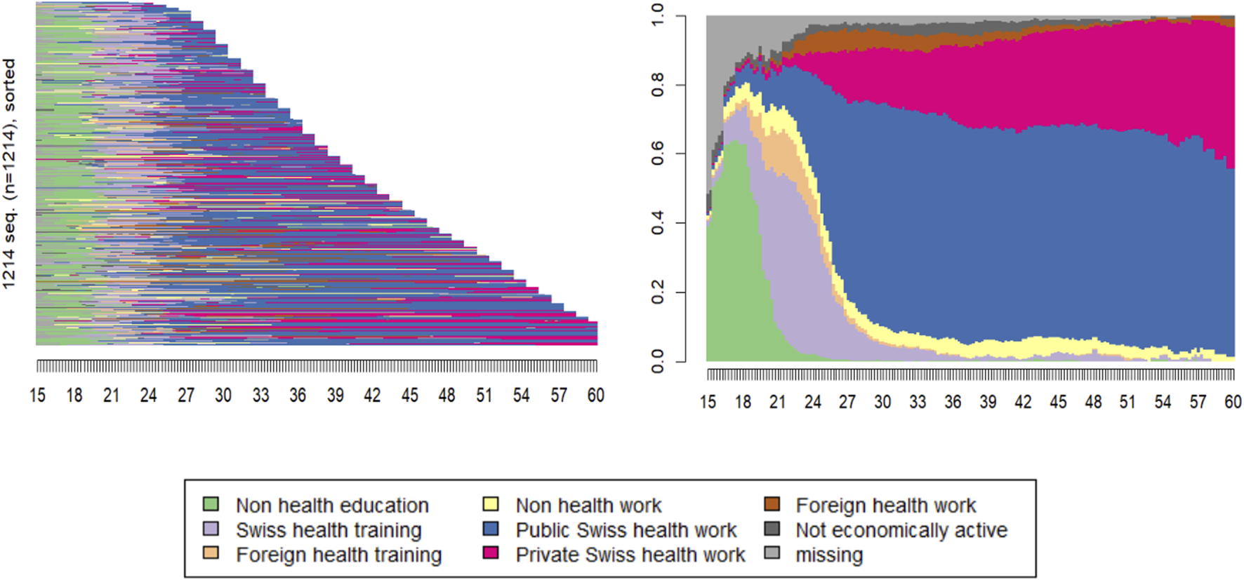 Example of a preliminary sequence analysis exploring 1214 career trajectories of Swiss healthcare professionals. The categorical states at the bottom are constructed based on information collected through a Life History Calendar. The x-axes correspond to the age (in years) of the individuals. The left plot shows all trajectories sorted by length, with the end corresponding to the individual’s age at time of data collection. The right plot shows the state distribution at each time point (Switzerland, 2025).