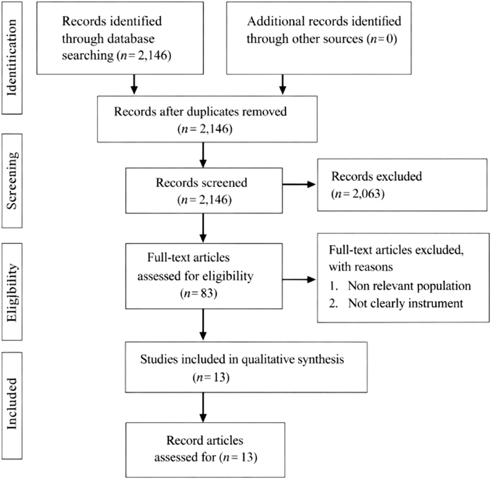 The database search identified 2,146 records. After removal of duplicates and screening of titles and abstracts, 83 full-text articles were assessed for eligibility. Of these, 70 articles were excluded for not meeting the inclusion criteria. Thirteen studies were included in the final qualitative synthesis. The study selection process is illustrated in Figure 1 using PRISMA flow diagram.