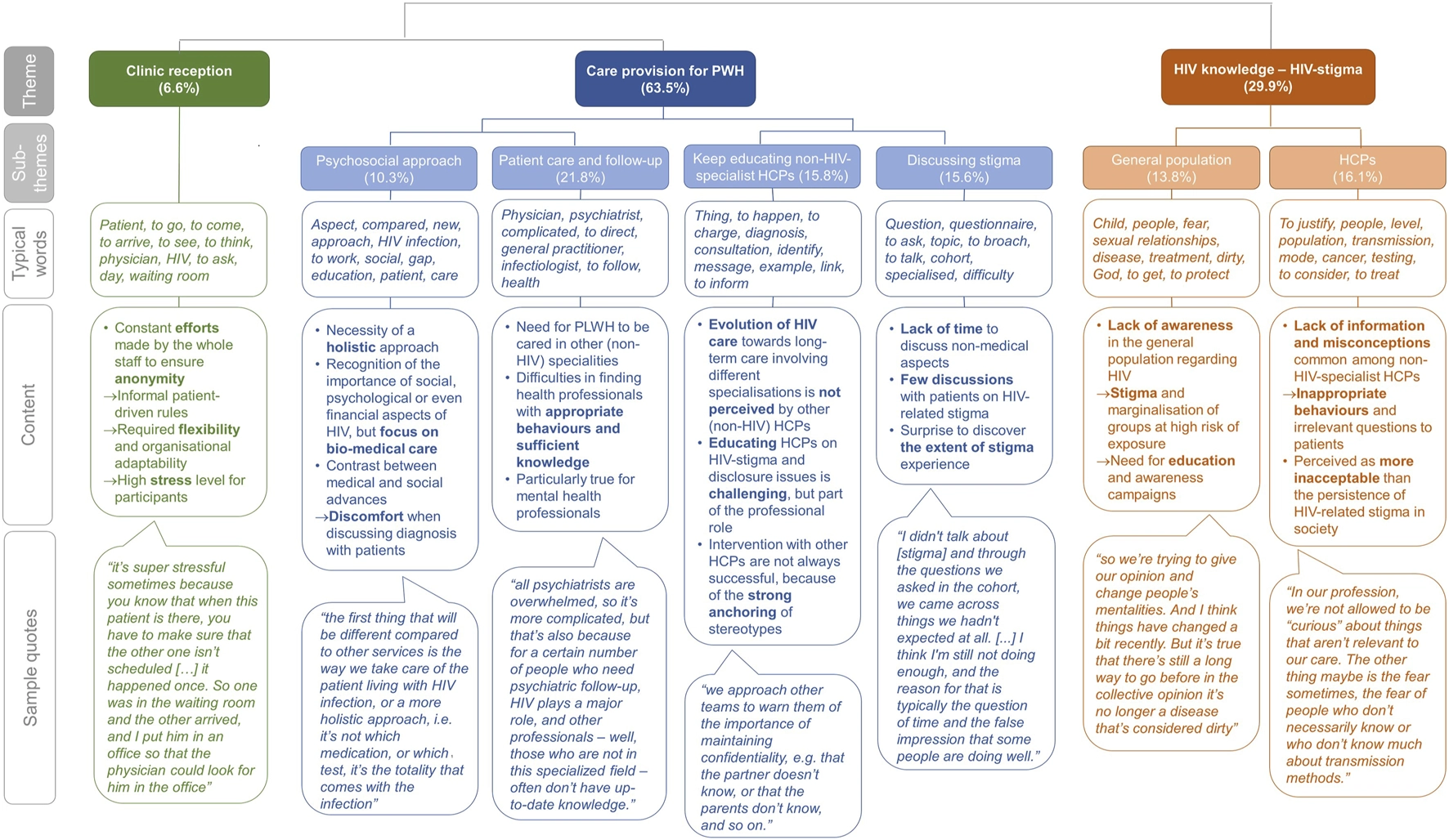 Computer-assisted analysis identified three main themes: 1) clinic reception, 2) care provision for PWH, and 3) HIV knowledge, the latter two being sub-divided into six sub-themes. These themes represented respectively 6.6%, 63.5% and 29.9% of the analysed text (Figure 1). Themes, sub-themes, typical words, content and sample quotes are presented in Figure 1. Additional quotes, illustrating specific aspects of the themes and sub-themes, are presented in Supplementary Material.