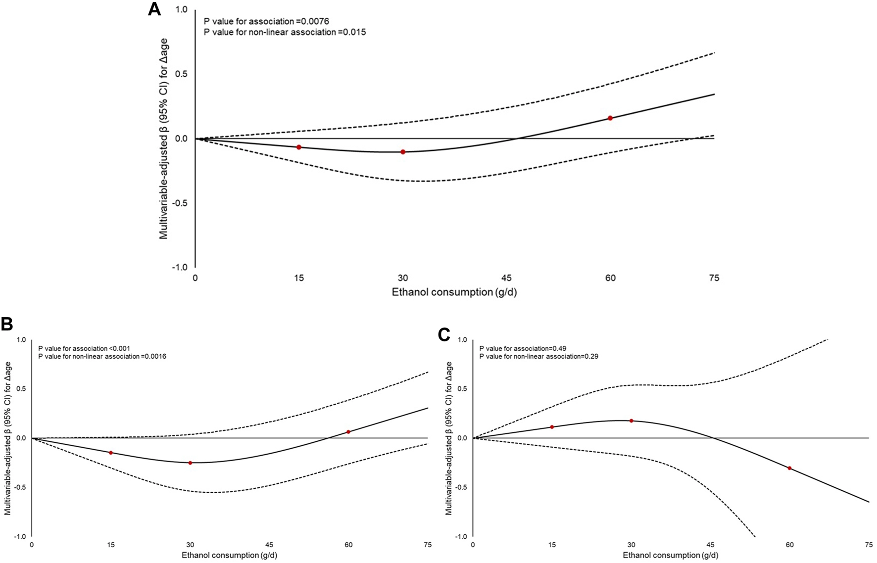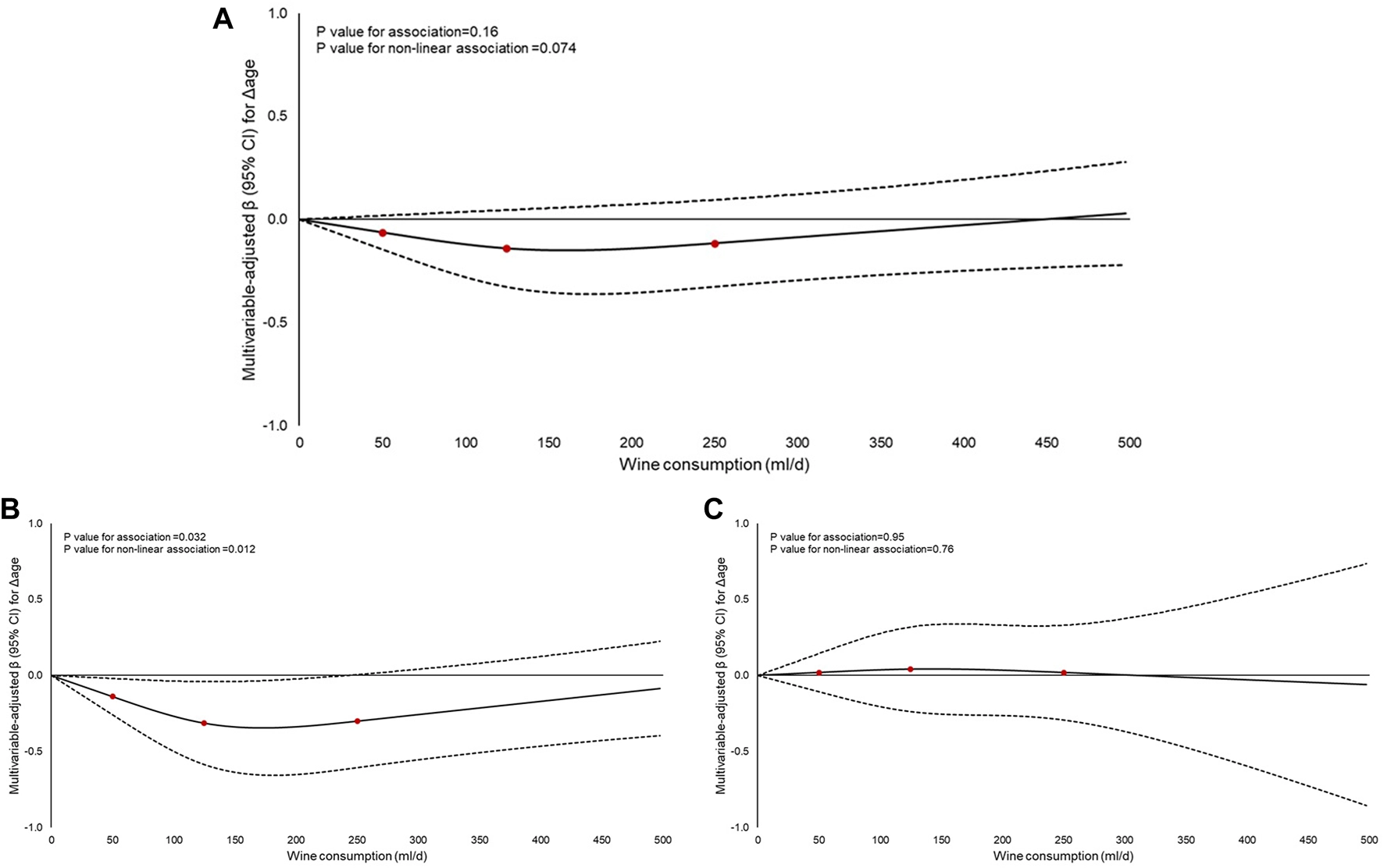The association between wine (mL/d) or ethanol (g/d) consumption and biological aging was also investigated using restricted cubic spline functions, in the sample where former drinkers were removed (n = 21,748) [38]. Knots were placed at 50, 125 and 250 mL/d of wine or 15, 30 and 60 g/d of ethanol to allow comparability between the spline analyses and those presenting estimates across categories of wine or ethanol consumption.