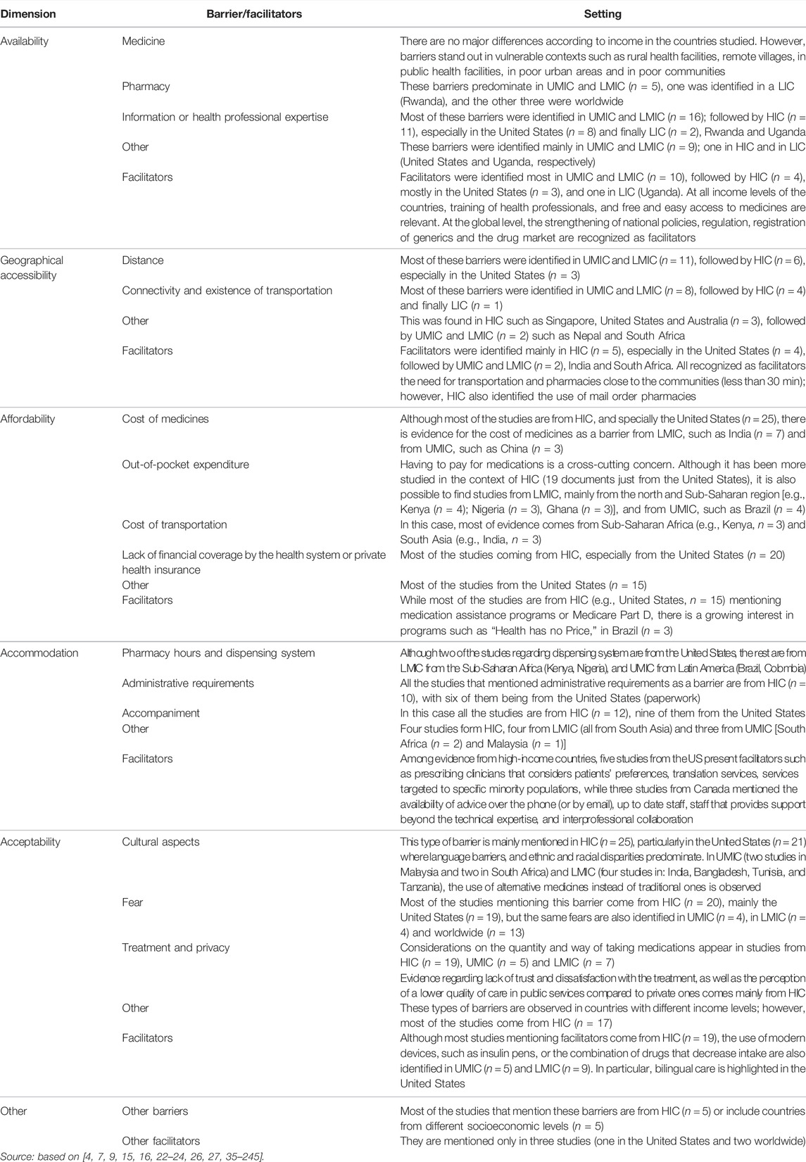 Results: The review included 219 documents. Diabetes was the most studied condition; most of the evidence comes from patients and the United States. Affordability and availability of medicines were the most reported dimension and specific barrier respectively, both cross-cutting concerns. Among high- and middle-income countries, identified barriers were cost of medicines, accompaniment by professionals, long distances to facilities, and cultural aspects; cost of transportation emerges in low-income settings. Facilitators reported were financial accessibility, trained health workers, medicines closer to communities, and patients’ education.