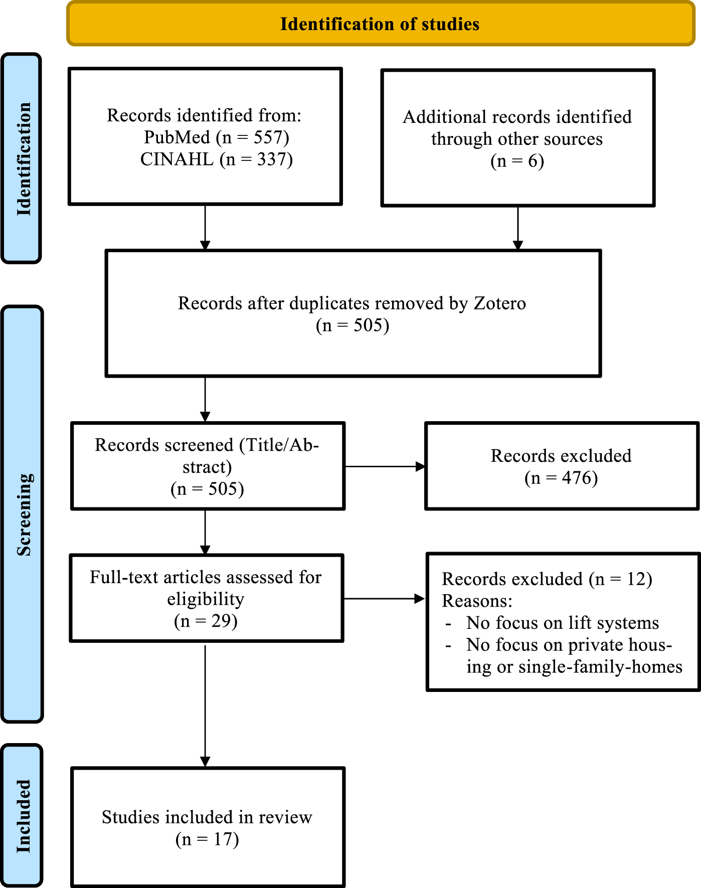 The search strategy applied in two data bases revealed 900 articles in total. A first search in the PubMed database yielded a total of 557 hits. An additional 337 studies were identified via the CINAHL Ultimate database. Furthermore, six additional records were identified through a hand search. All 900 references were imported into Zotero, and after removing duplicates, 505 unique records remained. These were screened by title and abstract, resulting in the inclusion of 29 full texts, which were assessed for eligibility. Twelve of these studies were excluded based on predefined criteria (no focus on a lift system, or no focus on the home environment as a setting). In total, 17 studies were included in the final literature review (see Figure 1).