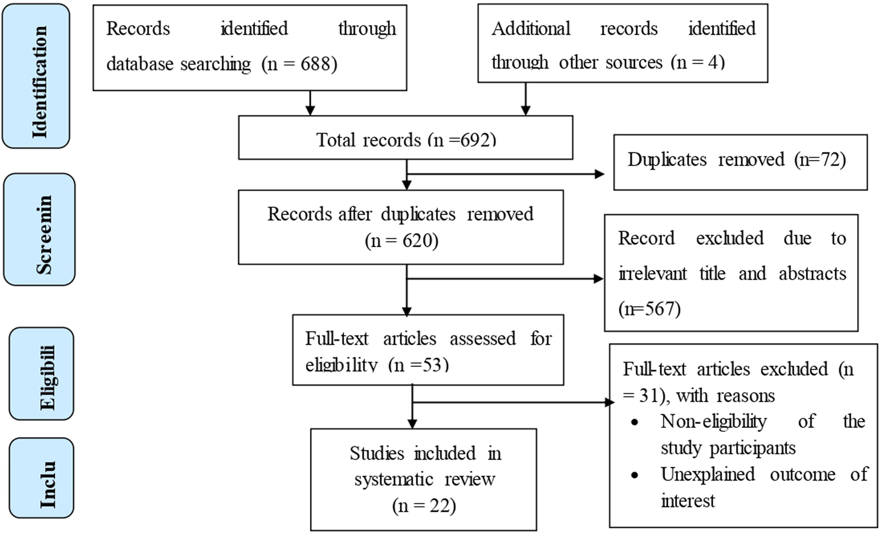 A total of 692 records regarding the prevalence of congenital anomalies and its predictors among newborns in Ethiopia were retrieved using electronic database searches. Of the identified records, 72 studies were excluded due to duplication. Following title and abstract screening, an additional 567 studies were excluded as they were not relevant for this systematic review and meta-analysis. The remaining 53 full-text articles were assessed for eligibility based on the predefined criteria, resulting in further exclusion of 31 studies. Ultimately, 22 studies that met all eligibility requirements were included in the final systematic review and meta-analysis (Figure 1).