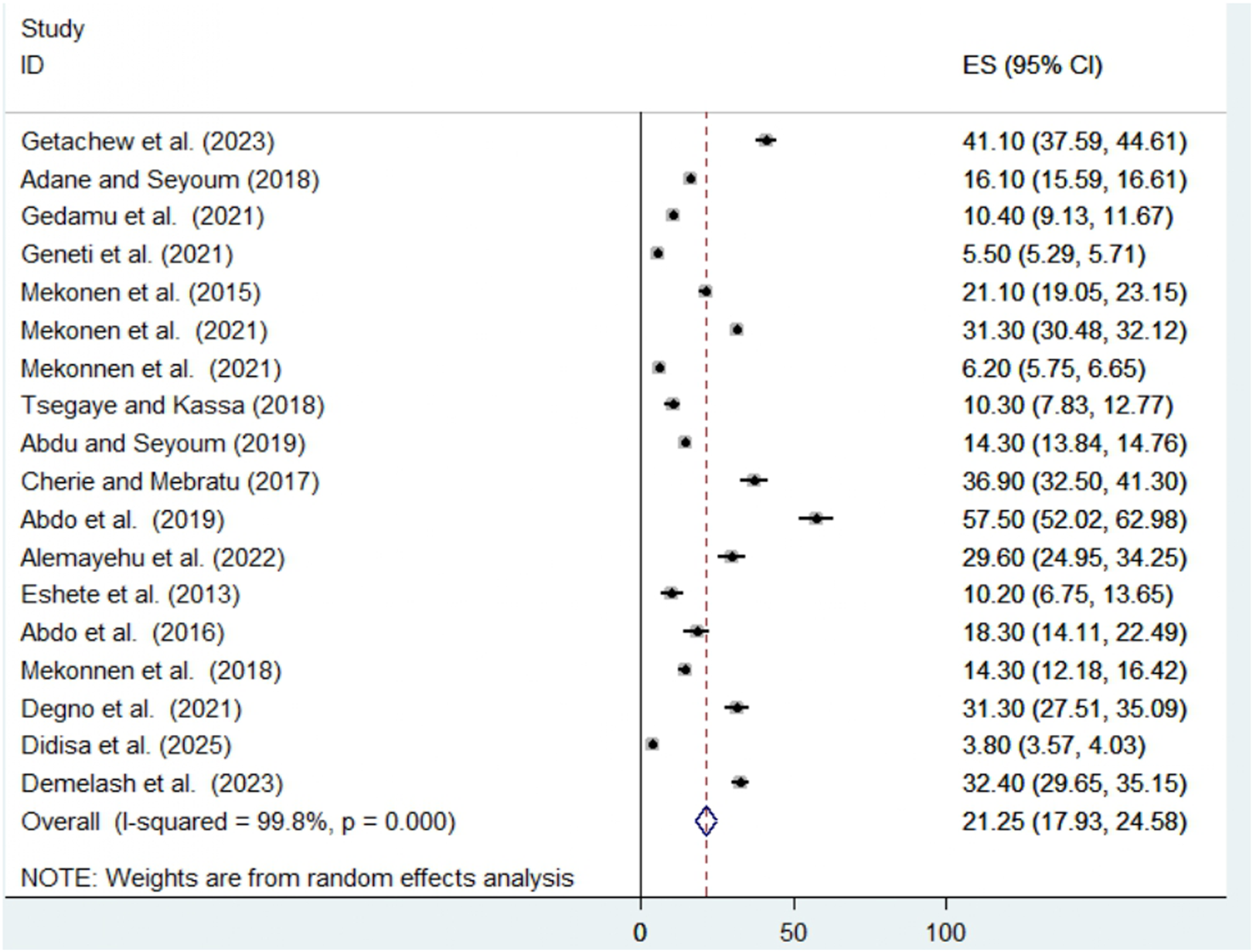 | Demelash et al. [33] | Unpublished | Harar | IBCS | 1,112 | 36 | 32.40 (29.65, 35.15) | 7 | Low risk |