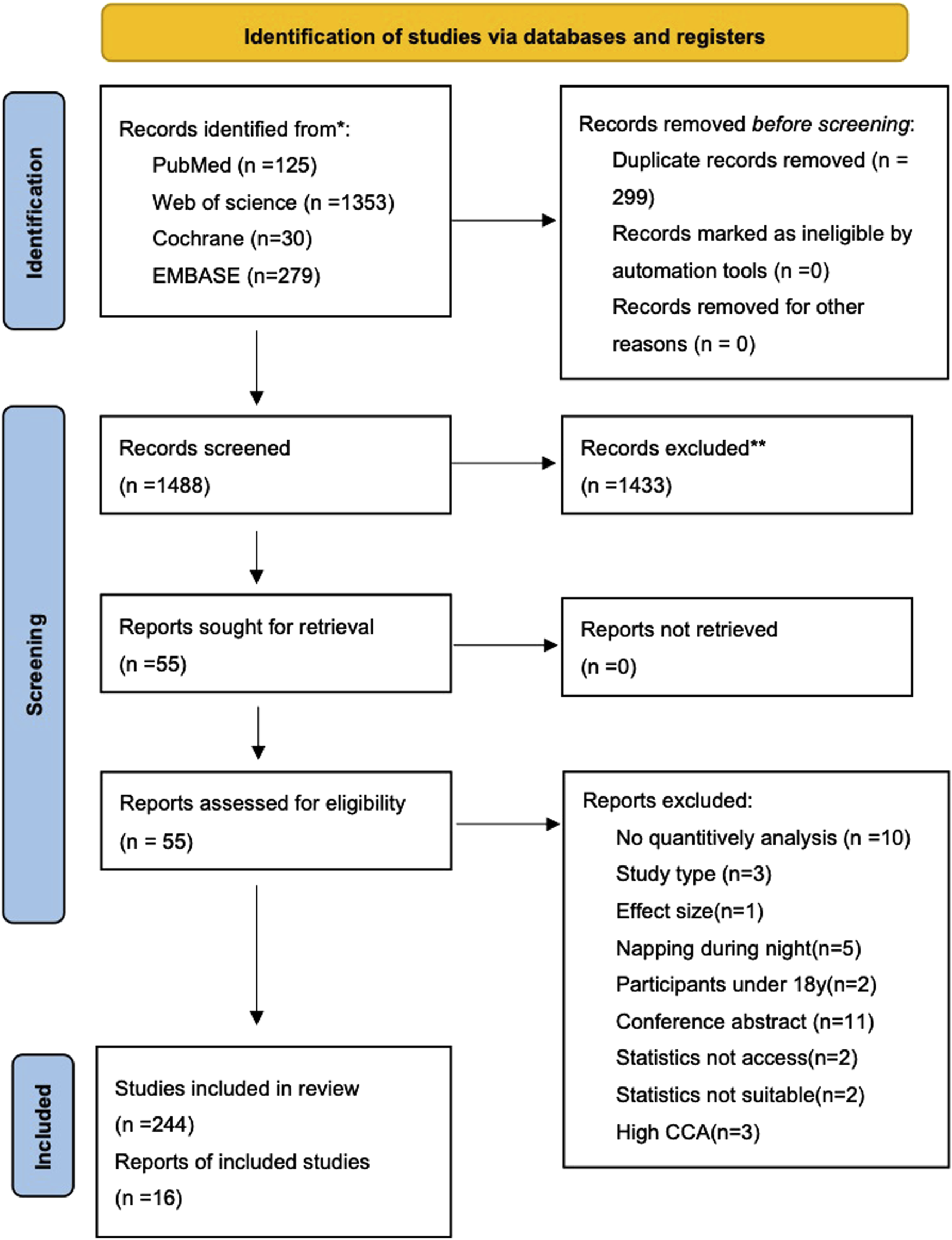 Exclusion criteria: 1) Conference abstracts, gray literature, protocols, animal studies, meta-analyses and systematic reviews without quantitative analyses; 2) Interventions and experimental groups that involved engaging in napping during nighttime or shift work; 3) Meta-analyses that evaluated the effects of daytime napping on health outcomes in certain disease populations; 4) Literature with a high rate of overlap that is covered by other more recent studies; 5) Articles written in languages other than English.