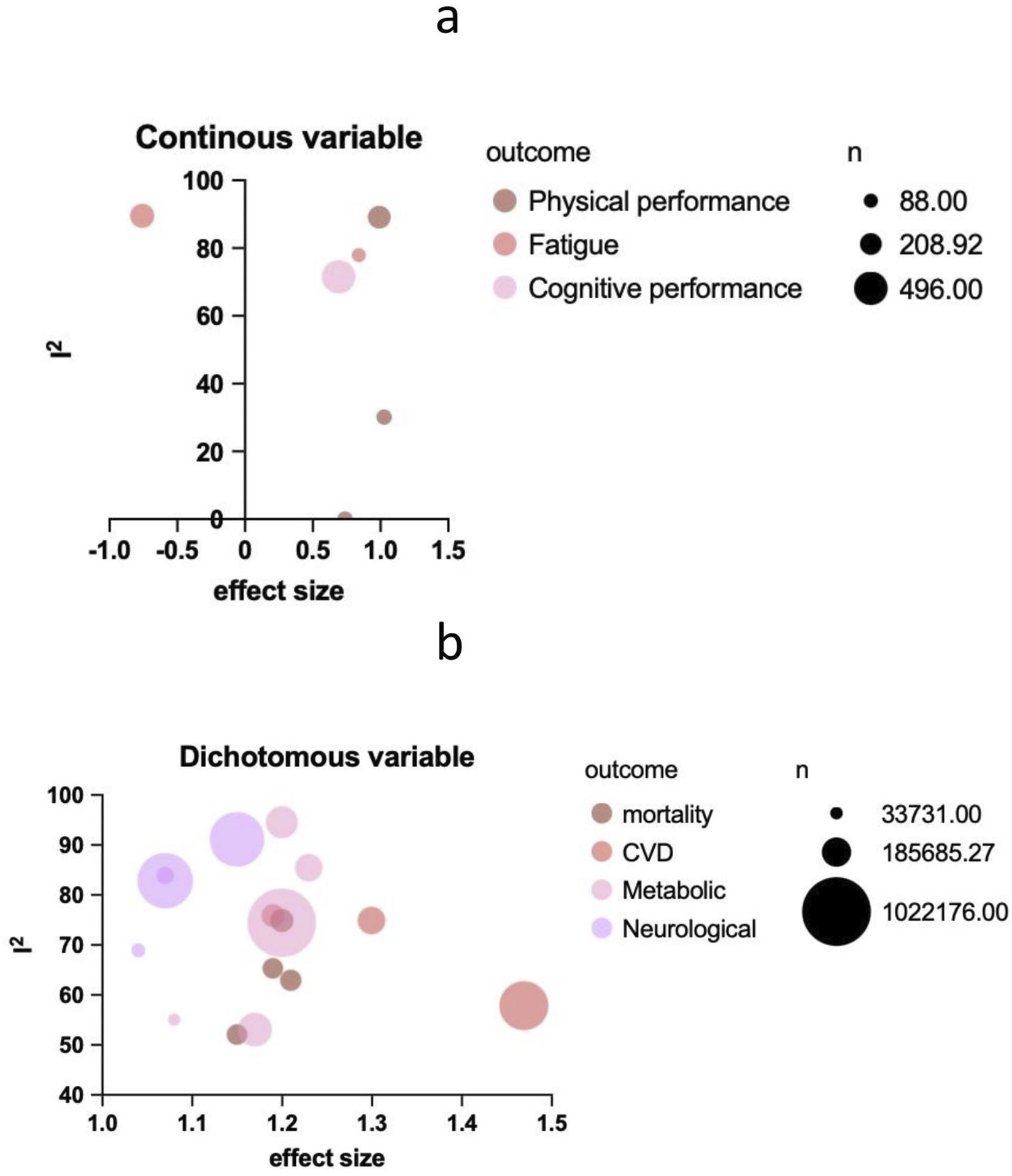 Bubble plot showing multiple health outcomes associated with daytime napping. (a) Continuous variable; (b) Dichotomous variable (Worldwide, 2015–2023).
