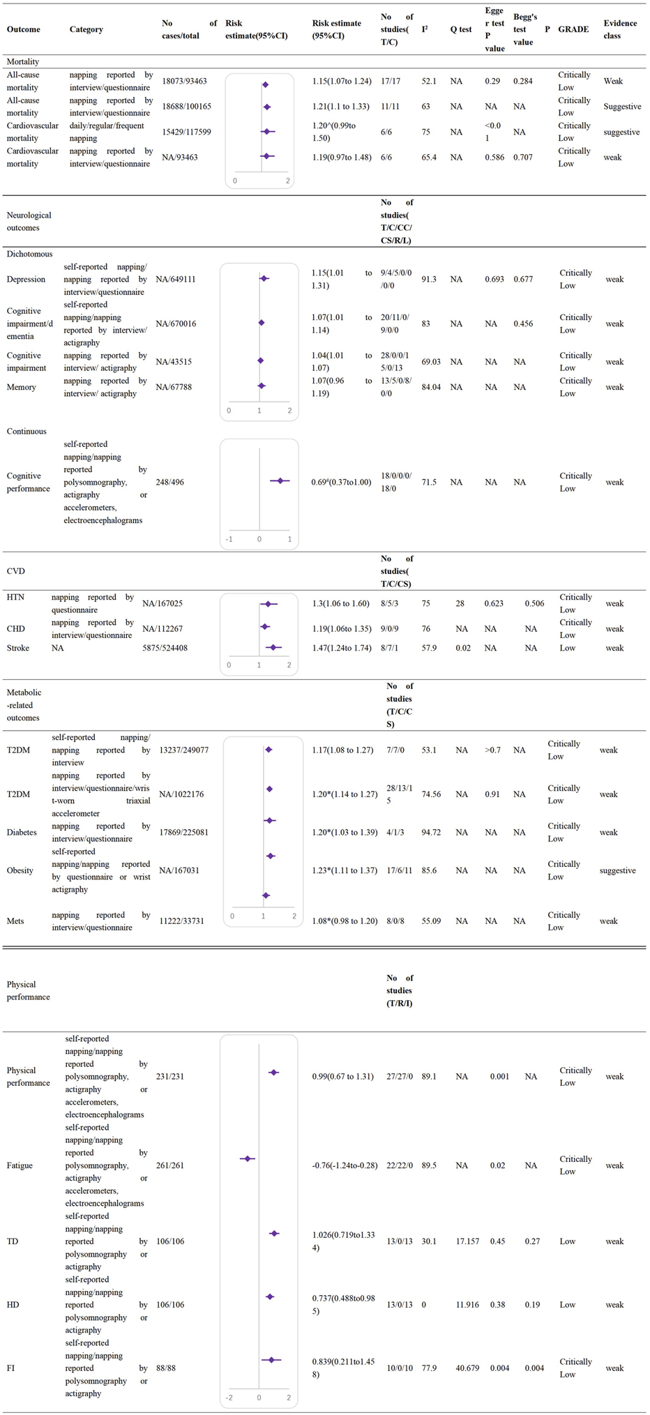 Significant non-dose-response relations between daytime napping and multiple health outcomes (Worldwide, 2015–2023). Note: CI, confidence interval; GRADE, Grading of Recommendations Assessment, Development and Evaluation; NA, not available; CC, case-control studies; R, randomized crossover trials; L, longitudinal studies; HTN: hypertension; CHD, coronary heart disease; CS, cross-sectional studies; T2DM, type 2 diabetes mellitus; Mets, metabolic syndromes; TD, total distance during the 5-m shuttle run test; HD, highest distance during the 5-m shuttle run test; FI, fatigue index during the 5-m shuttle run test; I, interventional prospective studies. *Hazard ratio ^Odds ratio #SMD.