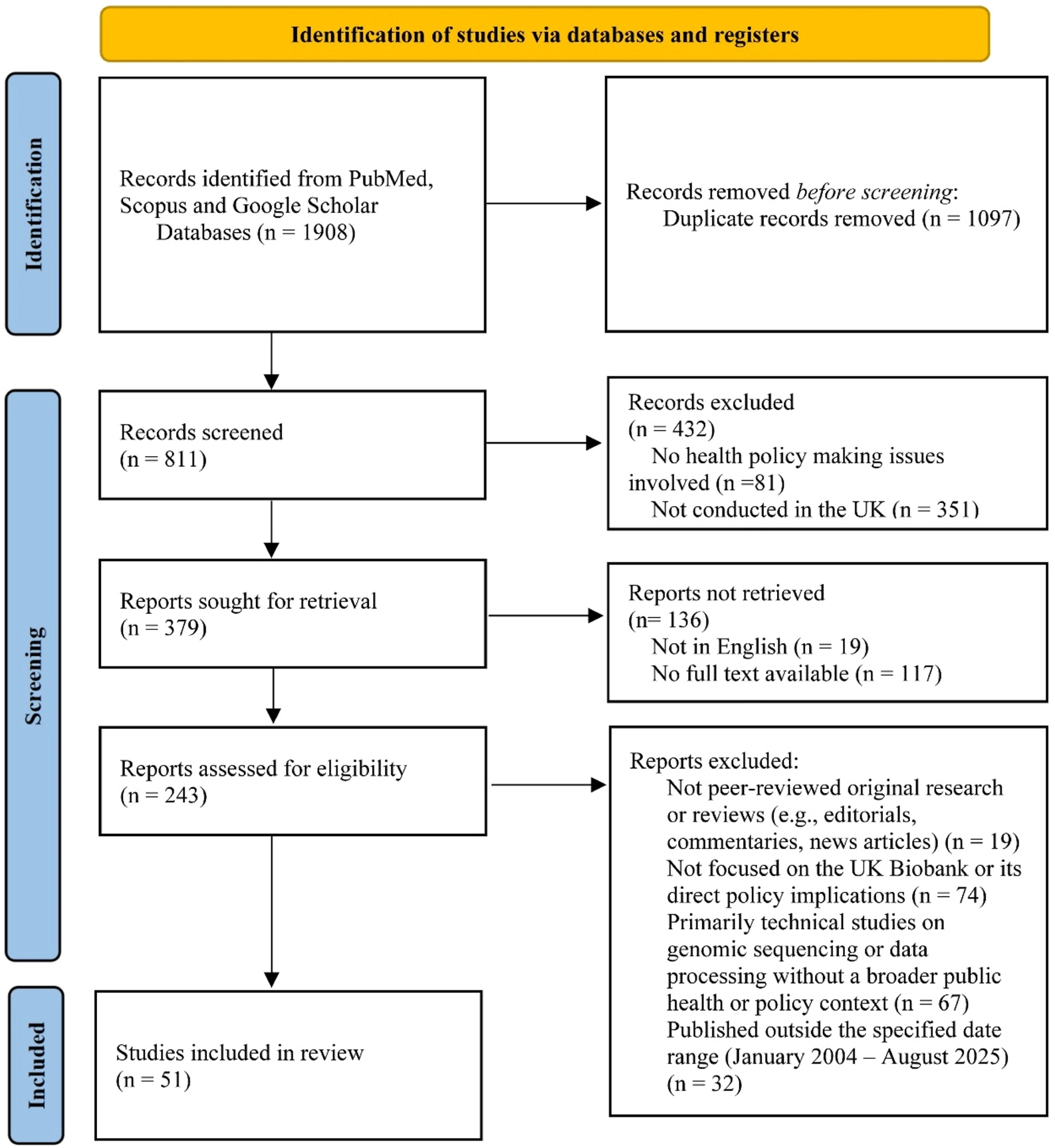 A two-phase screening process took place. Initially, the article abstracts were read independently by two reviewers to decide which papers would be included. Article abstracts (a) the functions of UK Biobank in the formulation of public health policies, and/or (b) The loopholes and deficiencies of UK biobank when used for formulating public health policies and/or (c) The role of biobanks in responding to transformations in global health governance (2nd phase) screening process. We systematically excluded articles that were: (1) not peer-reviewed original research or reviews (e.g., editorials, commentaries, news articles); (2) not focused on the UK Biobank or its direct policy implications; (3) primarily technical studies on genomic sequencing or data processing without a broader public health or policy context; or (4) published outside the specified date range (January 2004 – August 2025). This systematic approach aimed to ensure the relevance and quality of the included literature. As a result, we identified 683 potentially relevant titles in our search and selected 51 studies in our review, reflecting “bio-think-tank” issues.