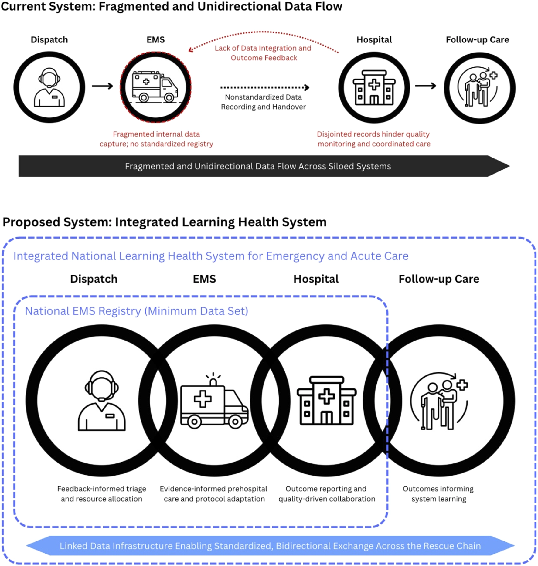 Figure 1 illustrates how a national EMS minimum dataset can transform the current linear pathway into an integrated learning system, enabling feedback-informed triage, evidence-based prehospital care, quality-driven care coordination, and outcome data that informs continuous system learning.